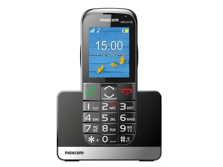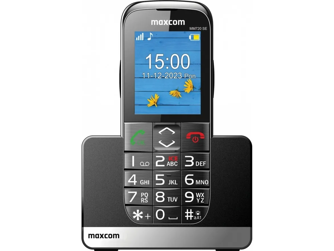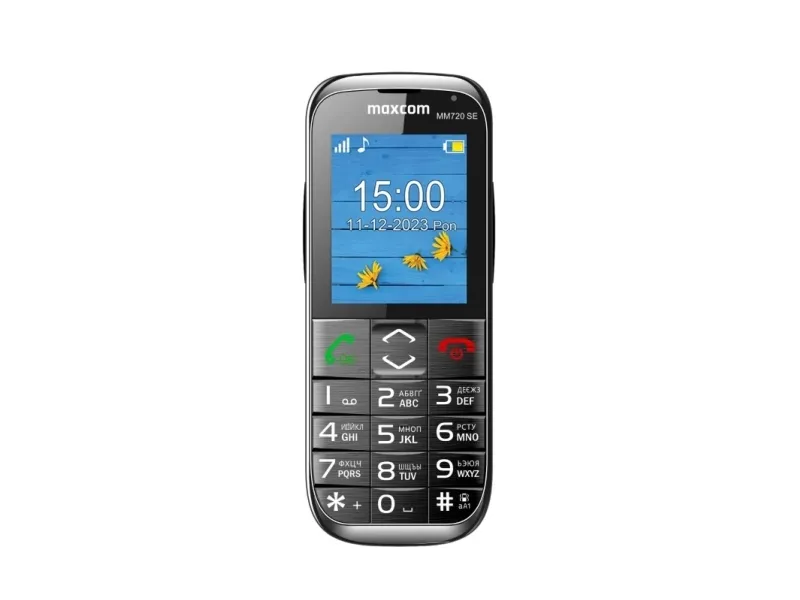 MaxCom MM720 SE. Form factor: Bar. Display diagonal: 5.59 cm (2.2"), Display resolution: 176 x 220 pixels. Rear camera resolution (numeric): 0.3 MP. Battery capacity: 800 mAh, Standby time (2G): 300 h. Weight: 82 g. Product colour: Black