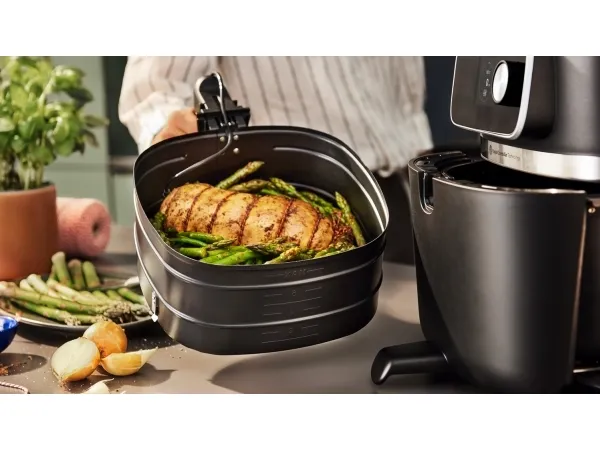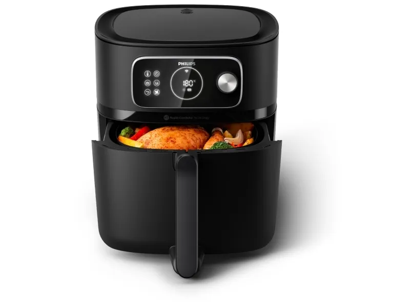 Oppdag Philips 7000 Series HD9876 varmluftsfriteuse, en allsidig kjøkkenkompanjong som er designet for å løfte matlagingsopplevelsen din. Dette apparatet har en sjenerøs kapasitet på 8,3 liter, noe som gjør det perfekt for familiemåltider og underholdning, og integrerer smart teknologi med Wi-Fi-tilkobling og smarttelefonkompatibilitet. Den sørger for at maten tilberedes raskt og jevnt, mens de variable temperaturinnstillingene og varmholdingsfunksjonen gir fleksibilitet for alle oppskrifter. Rengjøringen er enkel med avtakbare deler som tåler oppvaskmaskin, og det elegante LED-displayet kombinert med intuitive knapper og berøringsplate gjør betjeningen enkel. Enten du ønsker å steke, bake eller steke, er Philips 7000 Series varmluftsfryser din løsning for deilige, sunne måltider med minimal innsats.
