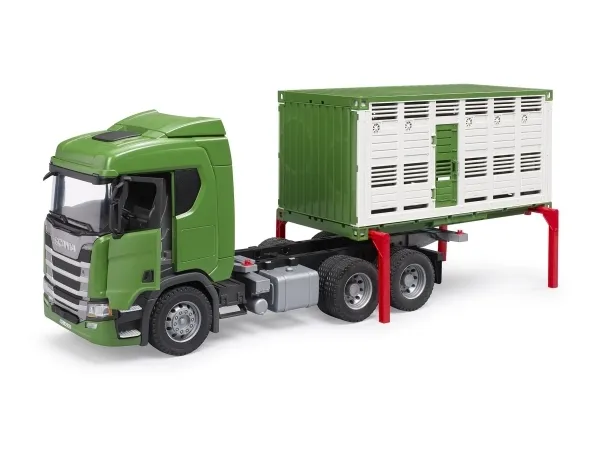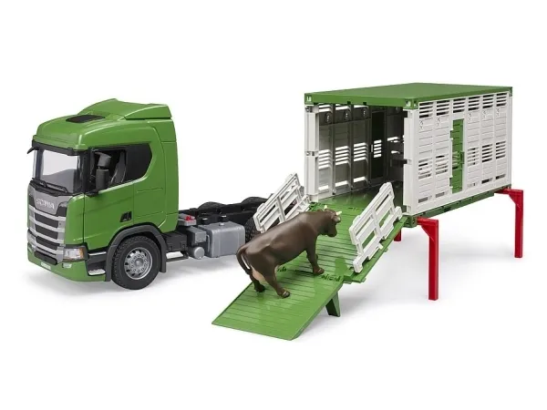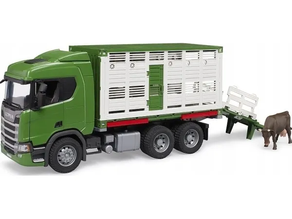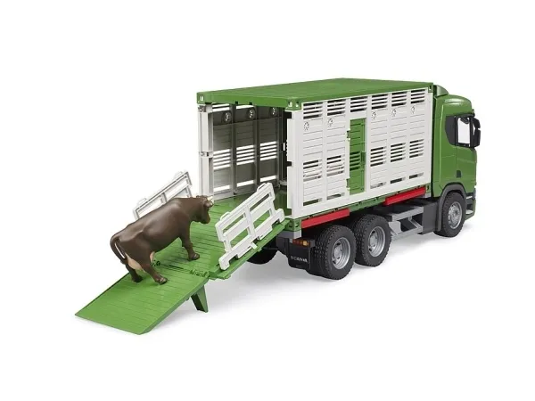 Scania Super 560R Kvægtransport lastbil med 1 kvæg Komfortabel og robust præsenterer BRUDER Scania Super R-serien i sit sortiment. R-serien karakteriseres af sin unikke kombination af komfort og holdbarhed. Den er derfor ideel til enhver situation, der kan opstå. Det er præcis disse forskellige situationer, som børn kan opleve realistisk med disse BRUDER-modeller. Køretøjet til transport af kvæg er udstyret med alt det nødvendige for korrekt og dyrevenlig transport af kvæg: Indlæsning og aflæsning af kvæg uden at skade dyrene ved hjælp af en foldbar, udtrækkelig rampe med foldbare rampegittere, foldbare interne opdelingsporte til at tilpasse sig forskellige arters pladsbehov, påsatte trug osv. En skaleret ko medfølger i Scania, yderligere køer og tyre fås med varenummer 02308 og 02309. Den nye førerhus følger Scanias typiske, dynamiske design. Foldbare sidespejle og døre kan åbnes, og der er også mulighed for at supplere med en lyd og lys Modul (varenummer 02801)