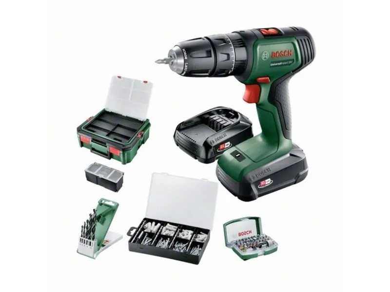Batteridrevet boreskruetrækker UniversalImpact 18V, 2 x batteri PBA 18V 1,5Ah + systemboks Momentvalg med 20 momenttrin, bore- og slagboring;;LED-lys FOR optimal belysning af arbejdsområdet;;10 -mm-skaft og en enkeltringet borepatron til lette skruemaskiner- og boreskift;;skruer og boring i træ og metal, slagboring i murværk;;Power FOR ALL: Et batteri til det komplette Home & Garden-apparatsystem Batteridrevet bore-/skruemaskine UniversalImpact 18V + systemboks, kompakt og effektivt allround-værktøj til udførelse af forskellige opgaver, drejningsmomentforvalg med 20 momenttrin, bore- og slagboring, LED-lys FOR optimal belysning af arbejdsområdet, 10 -mm-skaft og en enkelt muffe til lette skruemaskine- og boreskift, skruer og boring i træ og metal, slagboring i murværk, Power FOR Power: et batteri til det komplette Home & Garden-enhedssystem, 2 x batteri PBA 18V 1.5Ah, enkelt systemboks størrelse S (1 600 A01 6CT), 173 dele. Bit-sæt til boring og fastgørelse (2 607 019 511), 5 dele Træbor, sæt (2 609 255 214), 32 dele Skruebit-sæt, oplader al 1810 CV, karton
