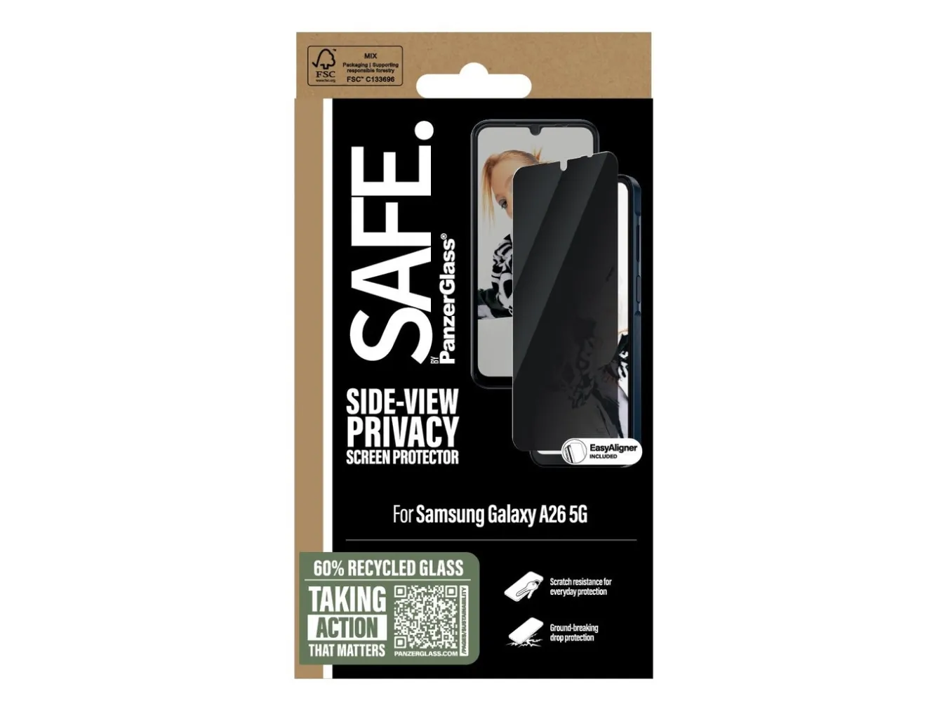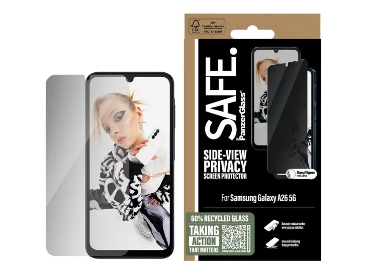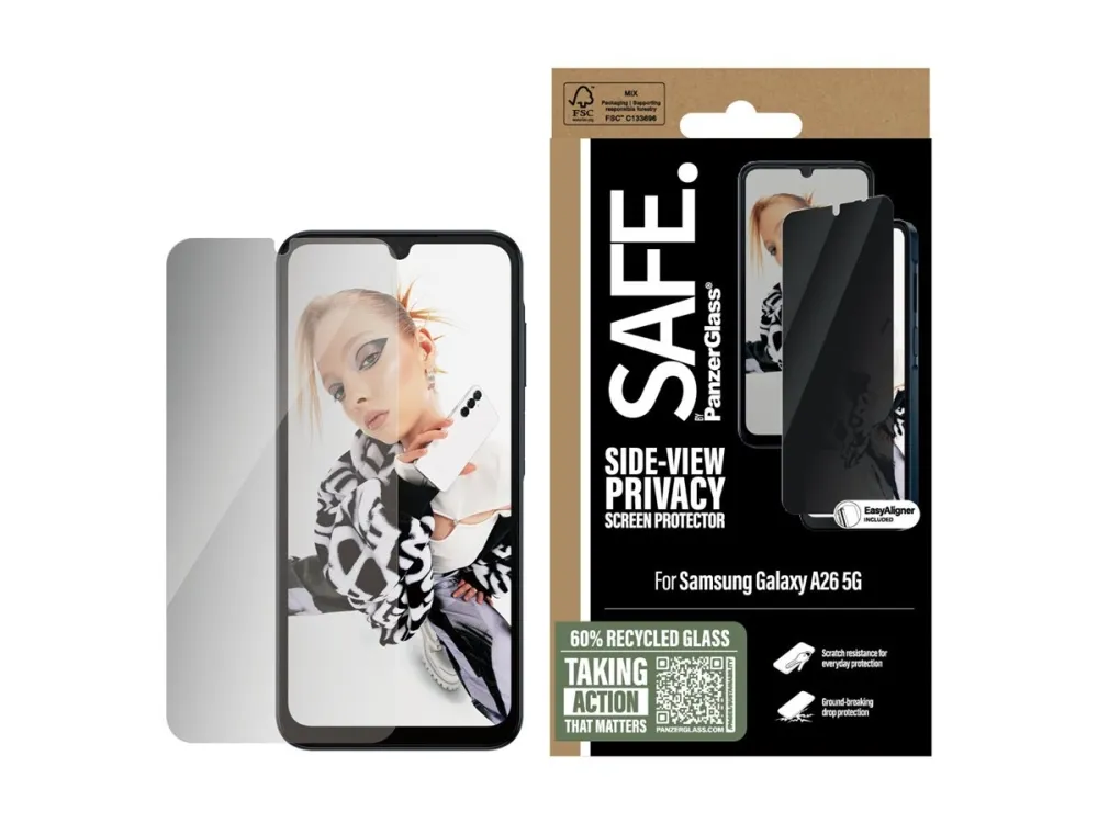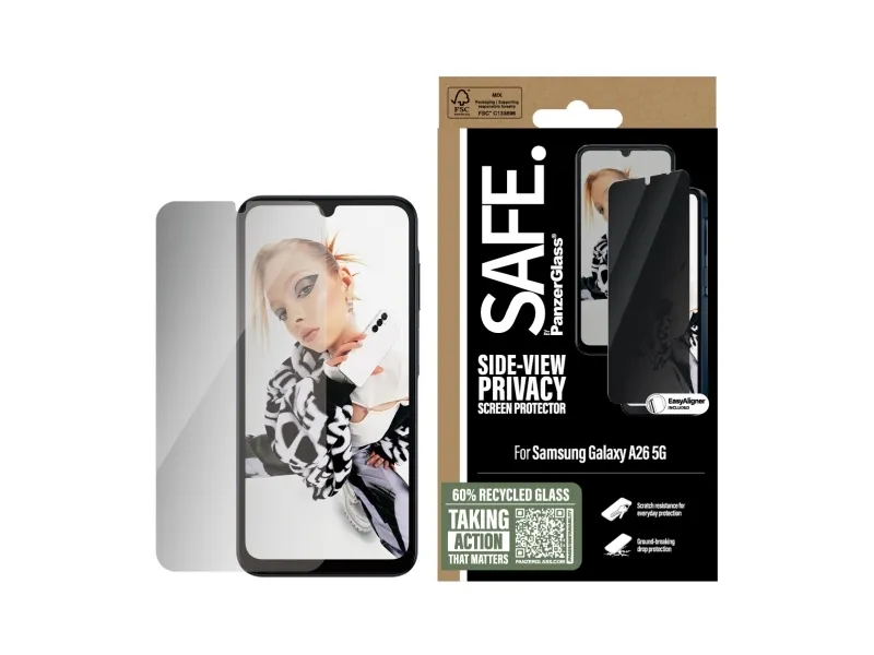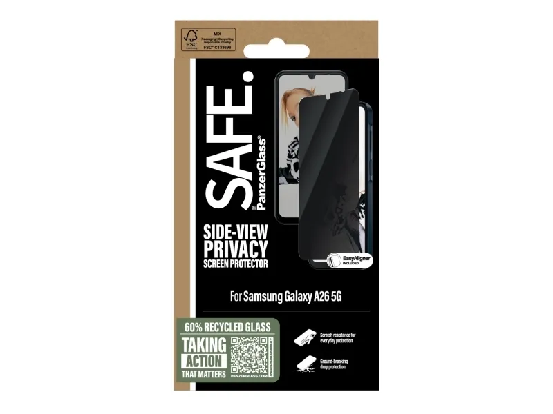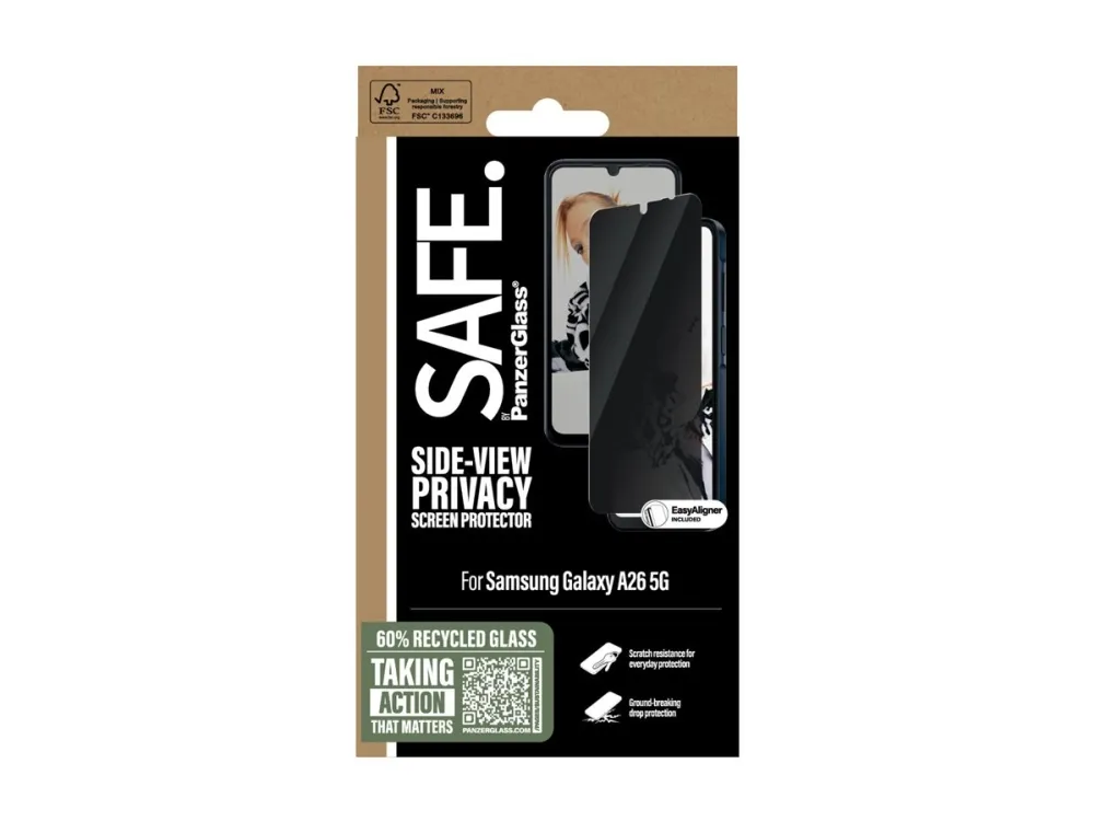 Everyone deserves to be SAFE.! You, your phone, and your private stuff! With this SAFE. by PanzerGlass privacy screen protector made of 60% recycled glass, your on-screen secrets are safe from nosy neighbours next to you on the train, in the bar or in class. The privacy filter makes the content of your screen virtually invisible to everyone except the person right in front of the screen: YOU! The glass even has a smudge-free coating that reduces traces of fingerprints and grease. And the screen protection? Well, let's put it this way: You no longer need to worry about dance floor mishaps, selfies gone wrong and your everyday fumbling, dropping and screen cracking! Can you feel it? Love is in the air. Love for phones and the planet. It's the new circle of phone life. When you keep your beloved phone SAFE., you can one day pass it on to another phone lover who will love it just as much as you do. Choose SAFE. and give your phone a second, third or fourth life! This is one way of working toward a more sustainable future! Another is to use more sustainable packaging. So, of course, this product comes in a recyclable FSC-certified box. It should be EASY to be SAFE.! Without hassle, red tape, or unnecessary complexity! This screen protector comes with an EasyAligner that makes installation a piece of cake (seriously!) and to make it even easier, we've included step-by-step instructions as well as a QR code for quick access to our online how-to video. And remember: You just need to install the screen protection once! Then you'll never again fear the sight of your phone tumbling to the ground screen first. This may not happen, but if it does, you'll regret not having clicked "add to cart". No screen protection is worth poor screen performance! That's why this screen protector comes in Ultra-Wide Fit, meaning it covers the front surface of your phone, providing a complete and crystal-clear view of your screen. It even leaves a little room around the edges for a case from CARE by PanzerGlass . And if you want to be extra SAFE., combine the screen protector and case with a SAFE. by PanzerGlass camera lens protector. Keep your phone SAFE.