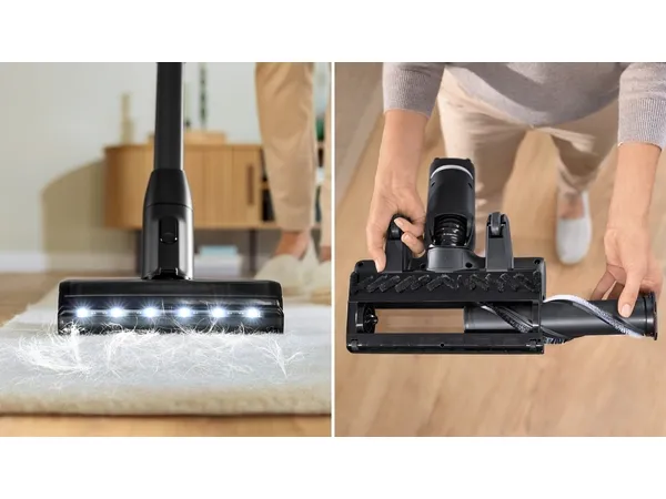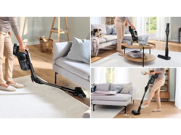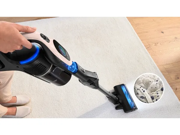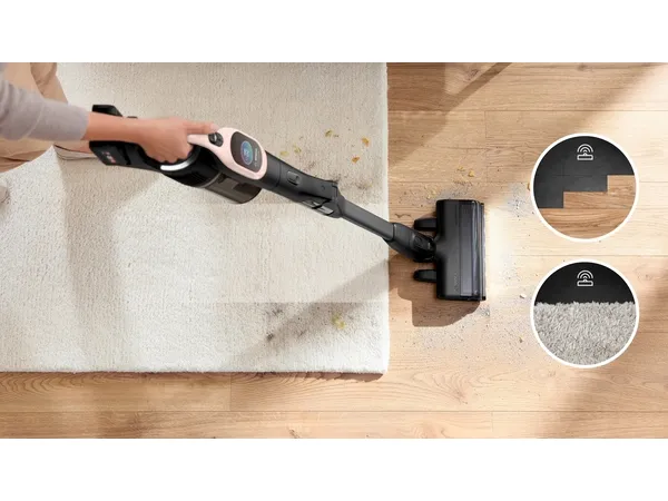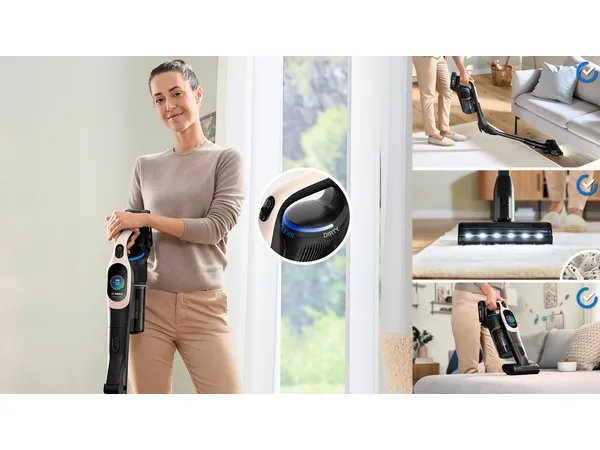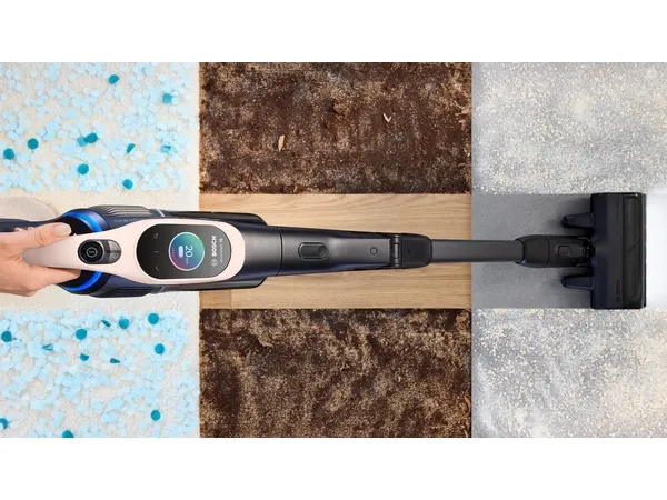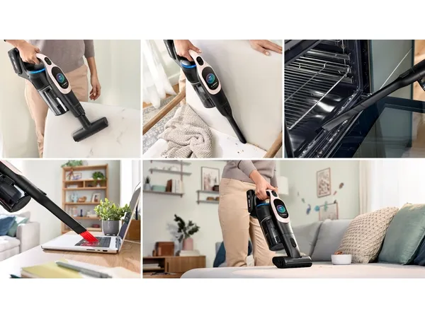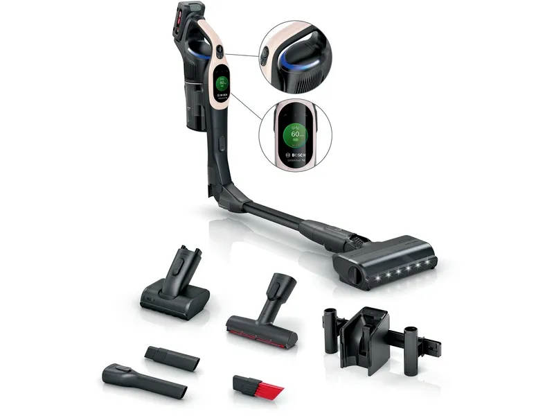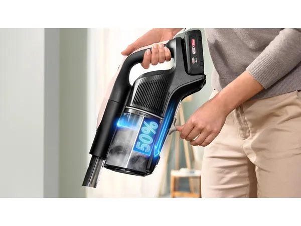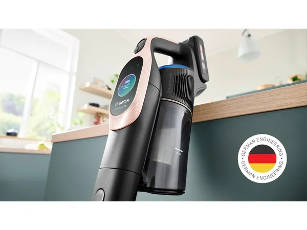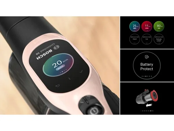 Battery indicator: You can follow the battery level on the LED display.Bosch BBS1041RBA. Product type: 2-in-1 stick vacuum, Product colour: Black, Pink. Cleaning type: Dry, Vacuum air filtering: HEPA, Hygiene Filter, Dirt separating method: Filtering. Power source: AC, Battery voltage: 18 V, Runtime: 80 min. Package width: 240 mm, Package depth: 300 mm, Package height: 1300 mm. Width: 250 mm, Depth: 216 mm, Height: 130 mm