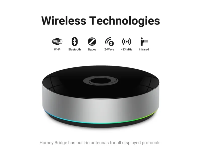 Upgrade your Homey experience with Homey Bridge by connecting Bluetooth, Zigbee, Z-Wave, 433 Mhz and Infrared devices.