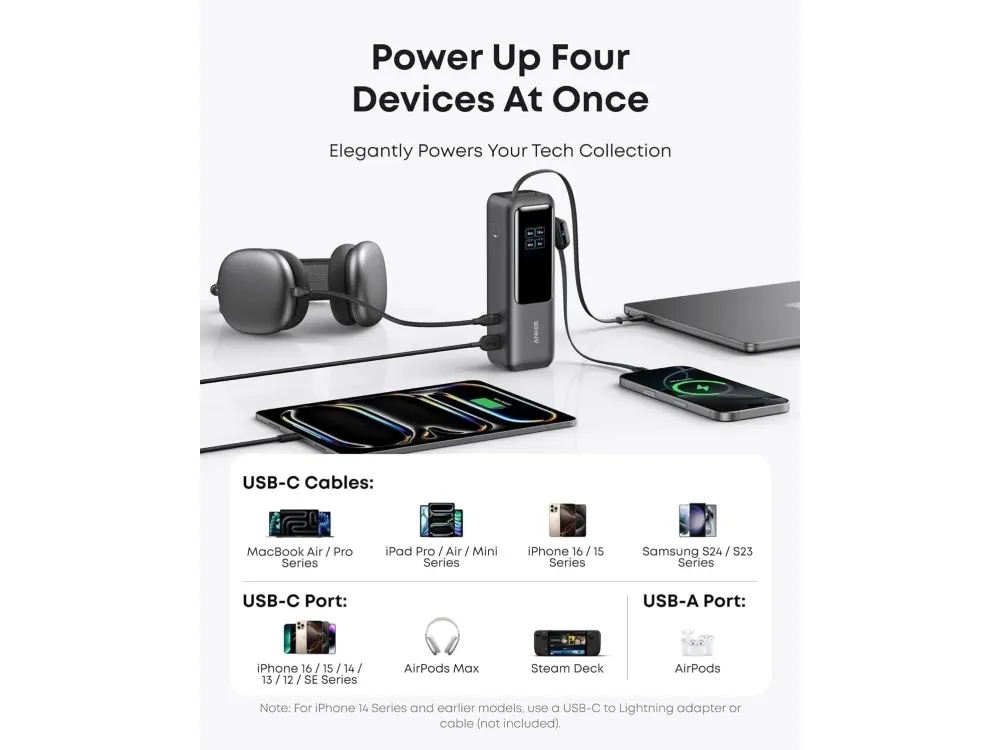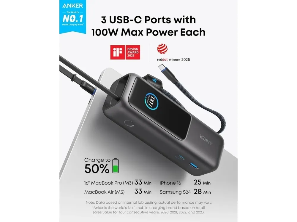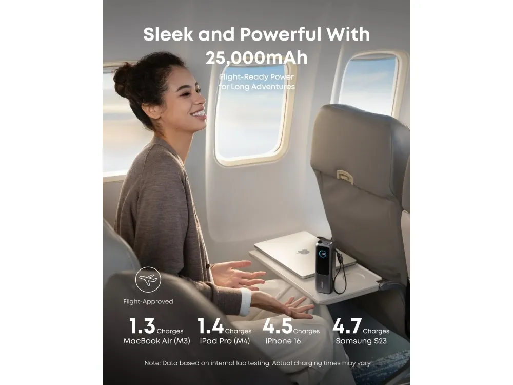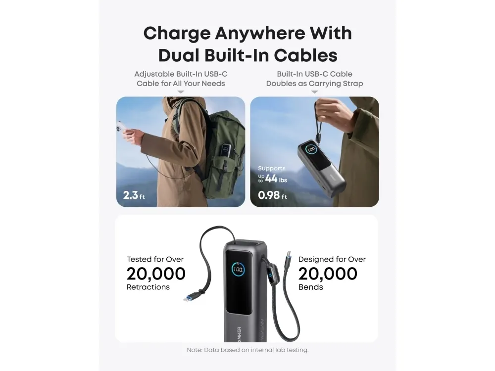 Anker-strømbanken er designet for å holde enheter ladet gjennom hele dagen med sin kapasitet på 25 000 mAh. Med innebygde og uttrekkbare kabler kan brukerne nyte enkel tilkobling uten å måtte håndtere ekstra kabler. Enheten støtter hurtiglading, noe som gir en rask energiboost, mens ActiveShield 2.0-beskyttelse sikrer sikkerhet under ladesykluser.