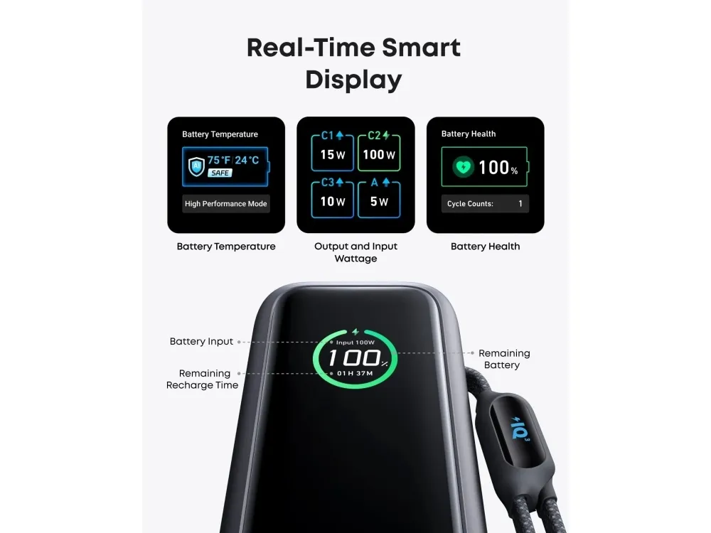 Denne powerbanken har en utgangseffekt på 165 watt, noe som gjør den egnet for bærbare datamaskiner og andre krevende enheter. Den har flere utgangskontakter, inkludert tre USB Type-C og en USB-A, som gjør det mulig å lade flere enheter samtidig. LED-displayet gir sanntidsinformasjon om strøminngang og -utgang, samt temperaturovervåking for ekstra sikkerhet.