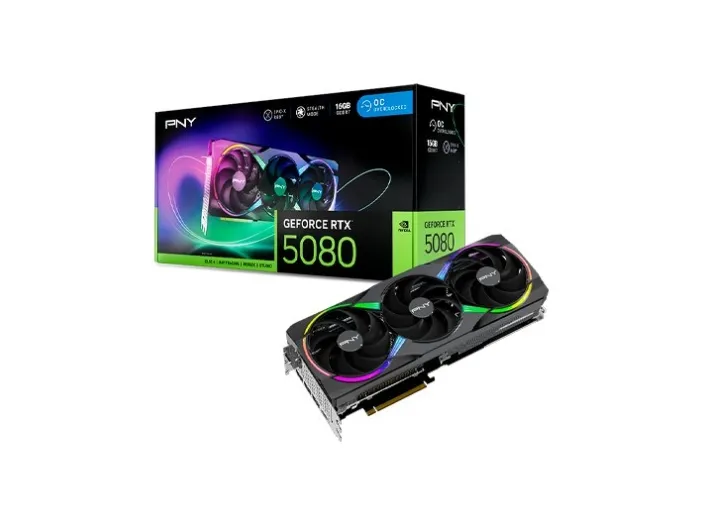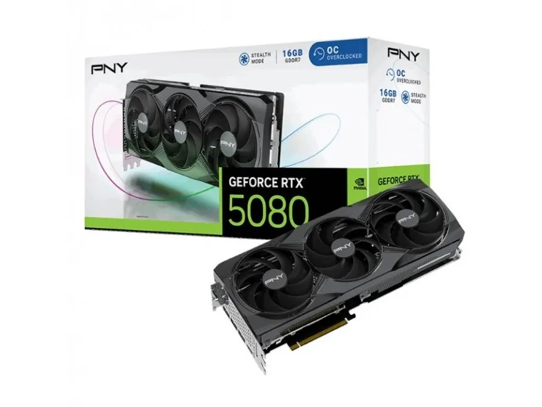 Experience exceptional graphics performance with the PNY GeForce RTX 5080 OC. Equipped with a powerful NVIDIA GeForce RTX 5080 graphics processor, this graphics card delivers visual fidelity and high frame rates. It supports up to 16 GB of GDDR7 SDRAM video memory with a bandwidth of 960 GBps, ensuring smooth gameplay and immersive experiences in detailed environments. The triple fan design enhances cooling efficiency, allowing for longer usage periods without overheating. Capable of achieving a max external resolution of 7680 x 4320, the RTX 5080 OC offers breathtaking visuals whether gaming or working with high-resolution content. Support for up to 4 monitors lets users expand their view and multitask efficiently. With features such as NVIDIA DLSS 4 and 4th generation Ray Tracing Cores, this graphics card offers realism and responsiveness in graphics-intensive applications, making it a prime choice for gamers and creators alike.
