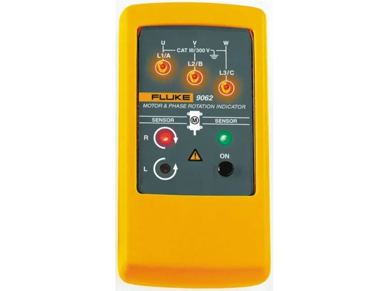 Unik indikator for faserotasjon med motorrotasjonsmulighet\nDen unike Fluke 9062 indikerer fasefølgens retning og motorrotasjon i tillegg til at du får fordelene med kontaktfri detektering. Fluke 9062 er spesiallaget for kommersielle og industrielle miljøer og gir rask indikasjon på 3-faserotasjon ved hjelp av testledningene som følger med. Den kan også brukes til finne motorrotasjonen på synkrone og asynkrone 3-fasemotorer. Kontaktfri detektering er ideell til bruk på motorer der akselen ikke er synlig. Testprobene som følger med, har variable klemmeåpninger for sikker kontakt, også i stikkontakter for industriell bruk.