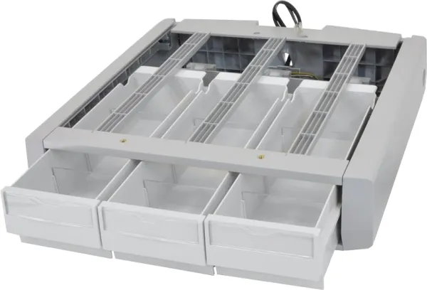 The supplemental drawer attaches under a cart’s primary drawer to provide additional secure storage space. Triple version provides three separate small drawers.\n\nThis drawer works in conjunction with the cart’s electronic auto-locking drawer system. A separately ordered Drawer Travel-Stop accessory is recommended if cart is configured with three, four or five drawer rows.