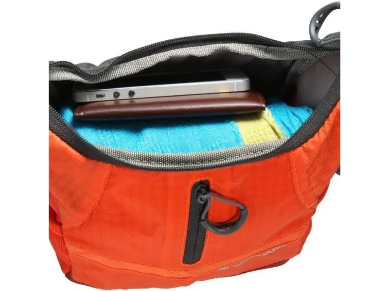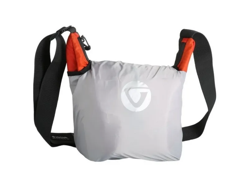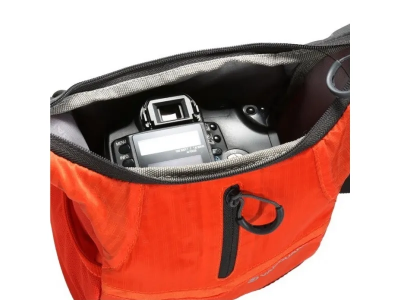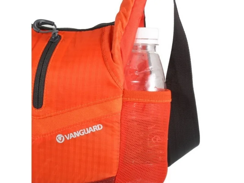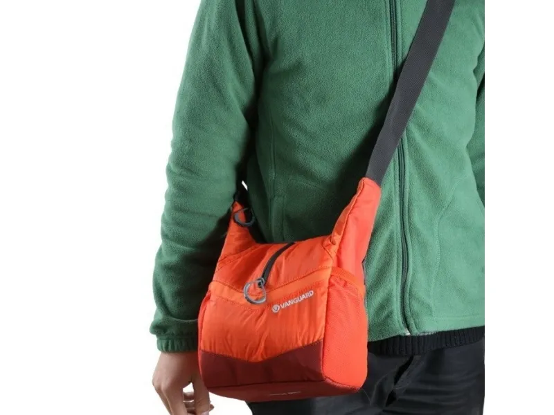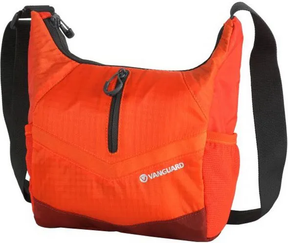Providing an easy-access top opening, this tri-colored orange Reno 18 Shoulder Bag from Vanguard holds a DSLR with an attached lens and an extra lens, or a mirrorless camera with a couple of lenses around a padded touch-fastened divider within the padded interior. For extra security, the bag is designed to look like it's not holding your camera gear. Your gear could also be removed to use the bag for everyday travel. There is a front accessory pocket that fits a lens cap or another small accessory, and dual side mesh slip pockets that fit a water bottle or other similar items. To carry the bag, there is an adjustable shoulder strap, and a removable rain cover is included for unpredictable weather.