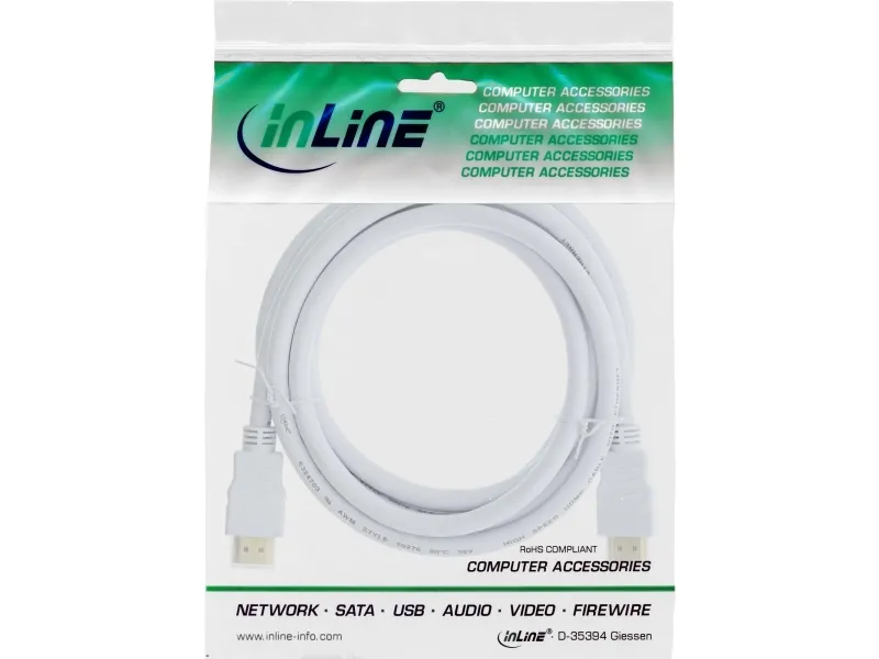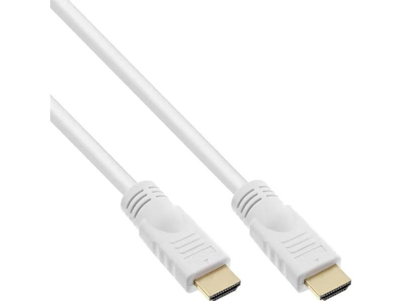 Gold-plated contacts The gold-plated plugs improve the conductivity, durability and corrosion resistance of the InLine HDMI cable. The risk of oxidation or corrosion is significantly reduced. This increases the long-term reliability of the connection, e.g. even in environments with higher humidity. Gold-plated contacts adapt better to the connections and are less susceptible to abrasion and damage when plugging and unplugging. In addition, the higher conductivity can improve signal transmission and therefore picture and sound quality, especially over longer cable runs.InLine High Speed HDMI Cable with Ethernet, M/M, white, golden contacts, 5m. Cable length: 5 m, Connector 1: HDMI Type A (Standard), Connector 1 gender: Male, Connector 2: HDMI Type A (Standard), Connector 2 gender: Male, Connector contacts plating: Gold, HDMI version: 2.0, 3D, Maximum resolution: 4096 x 2160 pixels, Product colour: White