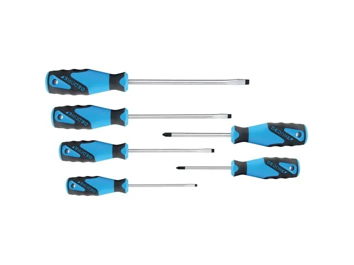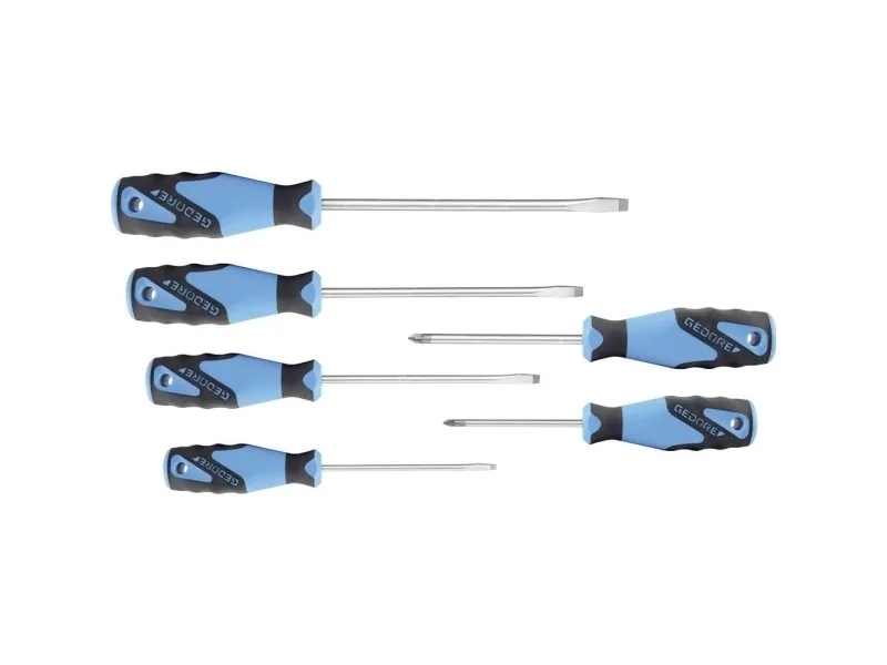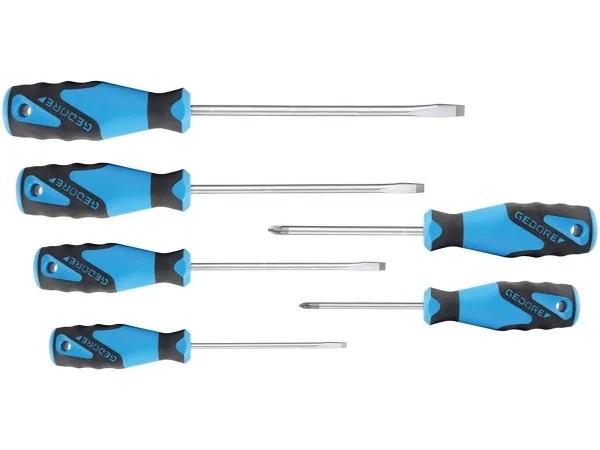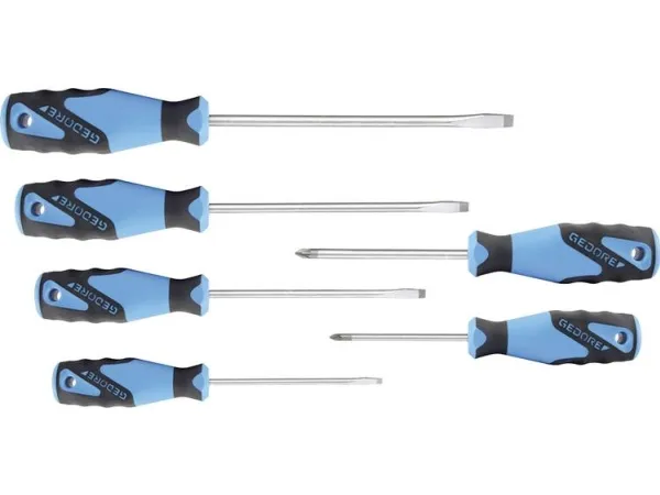Practical set composition in environmentally-friendly cardboard box. For slotted and cross-head screws Pozi PZ. 3-component handles Power-Grip3 with hanging hole. Ergonomic handle design enables precise and fatigue-free working. Positive-fit joint of handle and blade for optimum transmission of force. Type of drive marked at end of the handle. Blade from Gedore molybdenum-vanadium-Plus tempered steel.