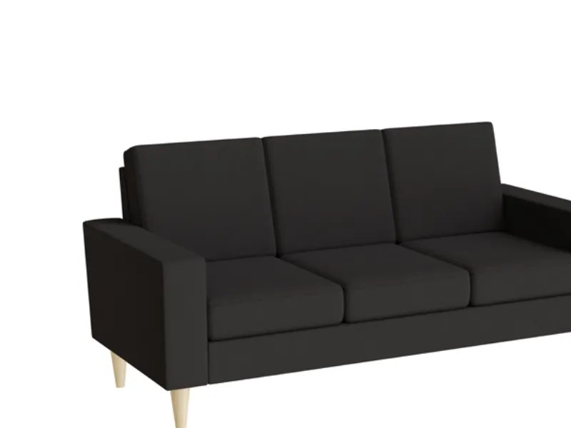 3-pers sofa model Stockholm med ben i massiv birk og sort tekstil med træramme og Nozag-bund. Polstring med koldskum. Findes også som 2-pers og som lænestol. Se flere varinater her.