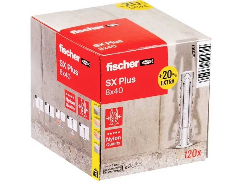 fischer udvidelses-dyvel SX Plus 8 x 40 + 20 % 4-dobbelt spredning sørger for optimal krafteindledning i byggematerialer og muliggør høje holdeværdier i fulde og hulbyggestoffer. De specielle fikseringsvinger sørger for en forfiksering af skruen, hvorved begge hænder er frie for brugeren under brug. Forhindrer at der opstår spredetryklefri dyvelhals, når skruen drejes ind, på byggematerialeoverfladen. På den måde forhindres udplacering af fliser og puds. Med dyvelens specielle form kan den let sættes i borehullet med blot nogle få hammerslag. Den udprægede dyvelkant forhindrer, at boret glider i borehullet, og giver en sikker montering. Takket være det mærkbare fasttrækningsmoment registrerer brugeren automatisk, hvornår skruen sidder rigtigt og forhindrer dermed en overskruning. fischer udvidelses-rawlpluggen SX Plus er med sin 4-dobbelte ekspansion egnet til massive byggematerialer som beton, kalksandsten og murværk. De specielle fikseringsvinger sørger for en fiksering af skruen, så den ikke skal holdes fast ved anvendelser over hovedet. Denne skruefiksering giver brugeren en fleksibel og komfortabel sammensætning. Den fleksible dyvelkant forhindrer desuden, at rawlpluggen kommer for langt ind i borehullet, hvilket giver en sikker montering. Det eksklusive materiale af polyamid muliggør vedvarende, sikker fastholdelse af en lang række fulde- og hulbyggestoffer.