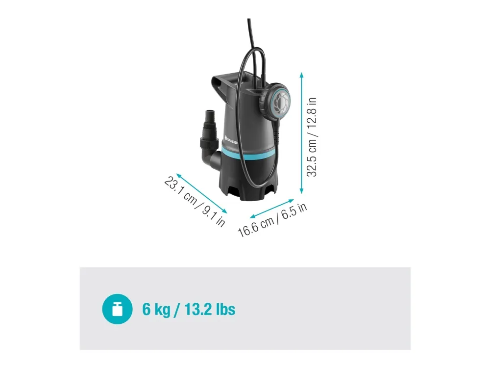 Gardena 20000 BASIC er en effektiv skittvannspumpe designet for ulike bruksområder. Med en 550 W elektrisk motor gir den robust ytelse samtidig som den er trådløs for enkel bruk. Denne pumpen kan effektivt håndtere en maksimal leveringskapasitet på 20 000 l/t og kan håndtere væsketemperaturer opp til 35 °C, noe som sikrer optimal drift for en rekke oppgaver. Den nedsenkbare funksjonen gjør at den kan brukes på dybder opp til 7 m, noe som gjør den ideell for drenering av oversvømte områder eller tømming av bassenger. De to slangetilkoblingene – 25 mm og 38 mm – gir fleksibilitet for ulike installasjonskrav. Gardena 20000 BASIC er utstyrt med en pålitelig låsemekanisme og filtreringsfunksjon for kornstørrelser opp til 35 mm, og gir stabil ytelse og holdbarhet. Med et maksimalt trykk på 0,9 bar og evnen til å levere vannhøyder på opptil 9 m, gir den en effektiv løsning for å håndtere skittent vann uten anstrengelse. IPX8-samsvar sikrer at denne pumpen forblir sikker og funksjonell selv når den er helt nedsenket i vann, noe som gir brukerne trygghet under drift.