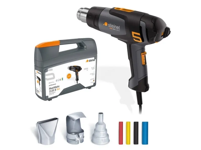 Steinel varmluftsblæser HM 2120 E sæt, 2200W varmluftspistol Eksklusiv keramik-opvarmning 3 m lang ledning for fleksibel håndtering Termosikring Termobeskyttelsesfrakobling Mulighed for ophæng Temperaturvisning med drejeknap med mærkede trin Børstemotor Kraftfuld. Præcis. Professionelt. For intenst arbejde uden træthed. Det kraftfulde allroundapparat HM 2120 E klarer varmluftarbejde på værkstedet og på byggepladsen helt uden problemer. Dette sørger ikke kun den kraftige motor for, men også den optimerede ergonomi og den praktiske enhåndsbetjening for. Det giver mulighed for mange timers krympning, forformer, svejsning eller løsning - alt efter hvilken dyse der lige er sat på. Temperaturen kan reguleres manuelt i 9 trin fra 80 til 630 °C - og luftmængden kan varieres i 3 trin fra 150 til 500 l/min. Det gør HeatMatic 2120 E til det ideelle begynderapparat for ægte professionelle.