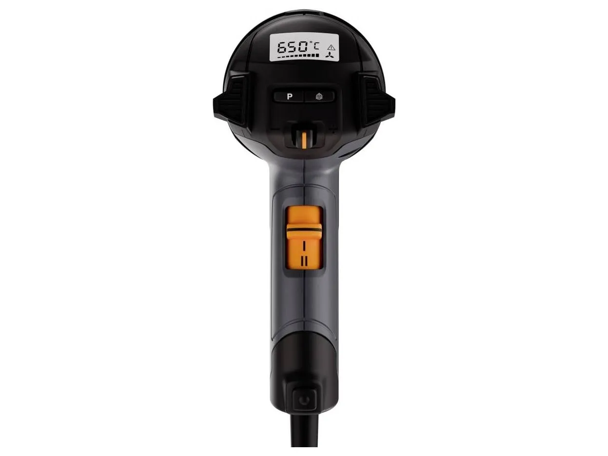 OBS! Denne produktbeskrivelse er endnu ikke blevet oversat til dansk af vores oversættere. Derfor er teksten maskineoversat fra den tyske originaltekst. Eco-tilstand med timer-funktion til automatisk frakobling, når den ikke bruges 2300 W med display Trinløst indstillelig temperatur i 10 °C trin fra 80-650°C. Luftmængde kan indstilles på 10 trin til 150-500l/min. 3 programmer kan gemmes for hurtig start ved tilbagevendende anvendelser