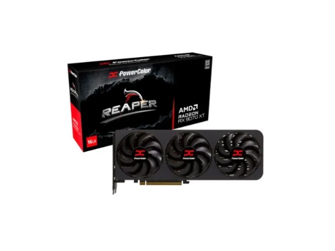 The Radeon RX 9070 XT graphics card from the PowerColor Reaper line delivers performance for gaming and professional applications. With 16 GB of GDDR6 SDRAM and a 256-bit bus width, it ensures high-speed data transfers and fluid visuals. Equipped with a powerful 2400 MHz clock speed and a boost clock speed of 2970 MHz, this graphics card is designed for demanding tasks, supporting resolutions up to 7680 x 4320 for immersive experiences.