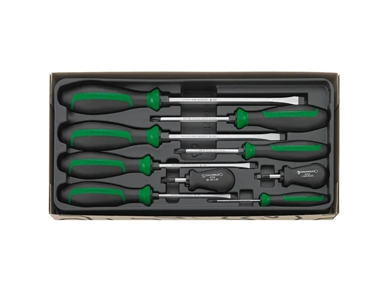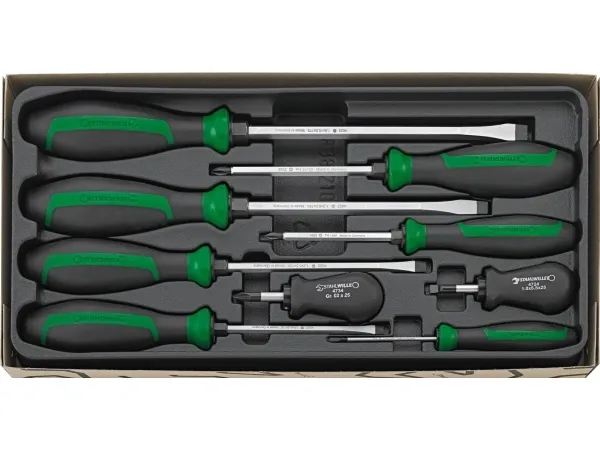 Skruetrækker-sæt DRALL+ Model4693/9 9 stk. - Sort spids - Krom Alloy Steel, matforkromet Indhold 9 dele: 4 krydskærvskruetrækkere: Nr. 4622: 1,0 x 5,5 x 100; 1,2 x 6,5 x 125; 1,2 x 8,0 x 150; 1,6 x 10,0 x 175 mm 1 skruetrækker med lige kærv nr. 4628: 0,4 x 2,5 x 60 mm 2 stjerneskruetrækkere nr. 4632: PH1; PH2 1 skruetrækker med lige kærv nr. 4724: 1,0 x 5,5 x 25 mm 1 krydskærvskruetrækker nr. 4734: PH2
