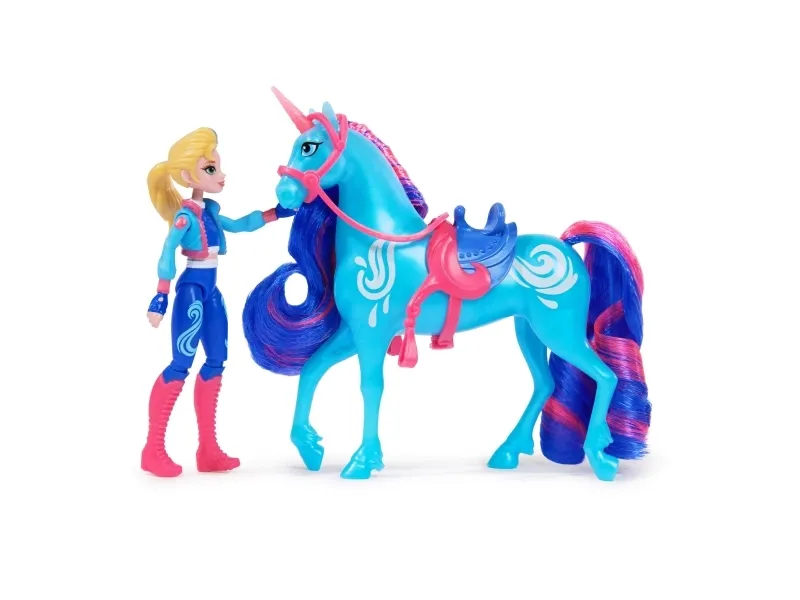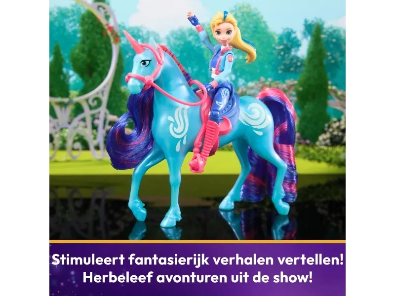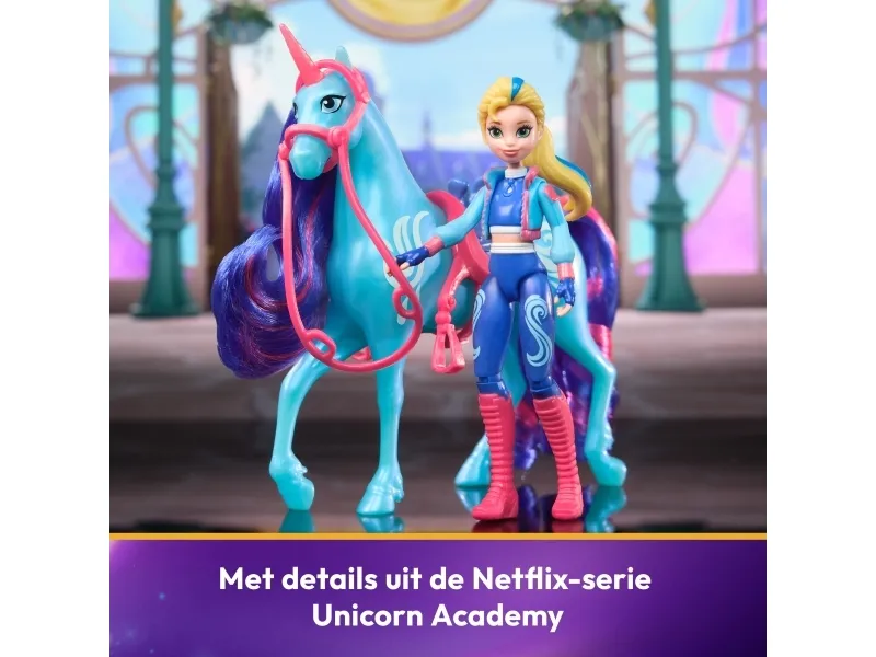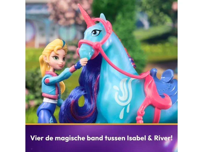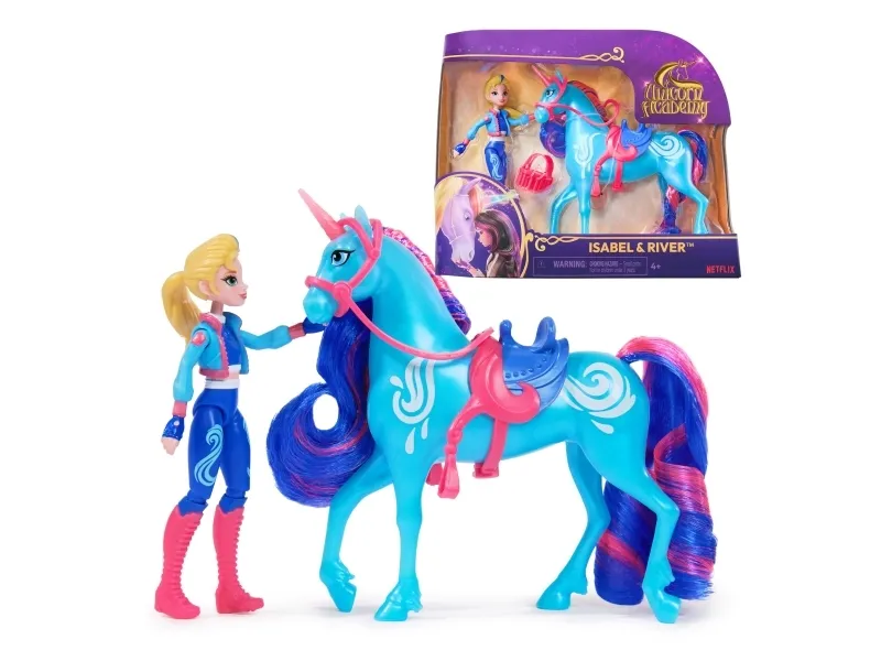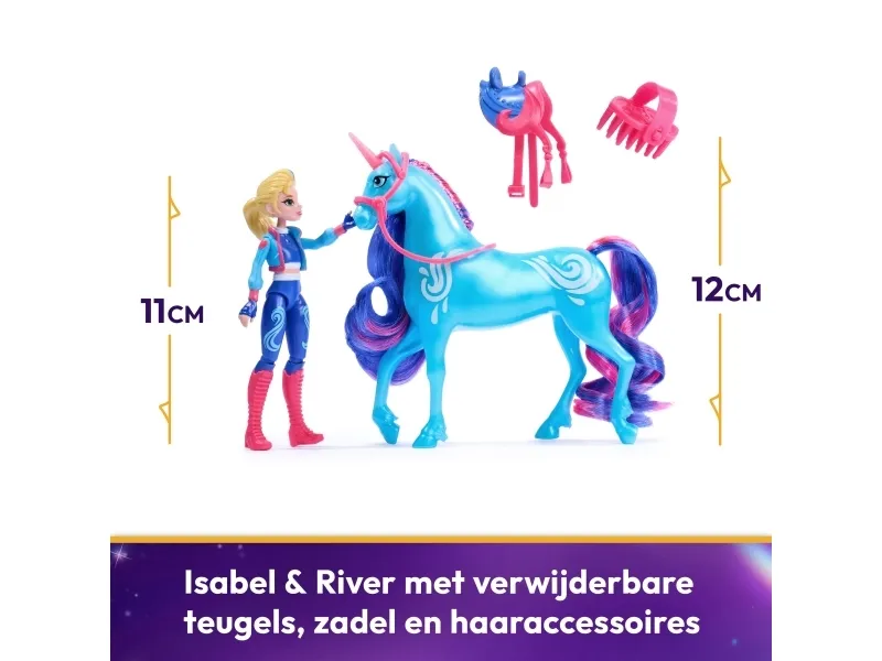 Isabel & River lekesettet fra Enhjørningakademiet hyller det sterke båndet mellom rytter og enhjørning. Isabel har 7 bevegelige ledd, realistiske detaljer tro mot serien og måler 11,4 cm. River komplimenterer Isabels utseende med vannmagimerker, samt blå og rosa man og hale som kan børstes (børste inkludert). Måler 12,7 cm. Med det avtakbare hodeutstyret og saltilbehøret sitter Isabel lett på River mens de rir ut på nye eventyr. Inspirert av NETFLIXs animasjonsserie og bestselgerbøker, hvor vennskap blomstrer, bringes figurene fra Enhjørningakademiet til live. Opplev og utvid din verden med motedukker, enhjørninger eller de små dukkene og lekesettene fra Enhjørningakademiet (selges separat). For barn som elsker enhjørninger, hesteleker, dukker og tilbehør, dukkehus, samleobjekter, plysjleker og mer, er leker fra Enhjørningakademiet en perfekt gave til enhver anledning. Opplev fortryllende Enhjørningakademieventyr med Isabel & River.