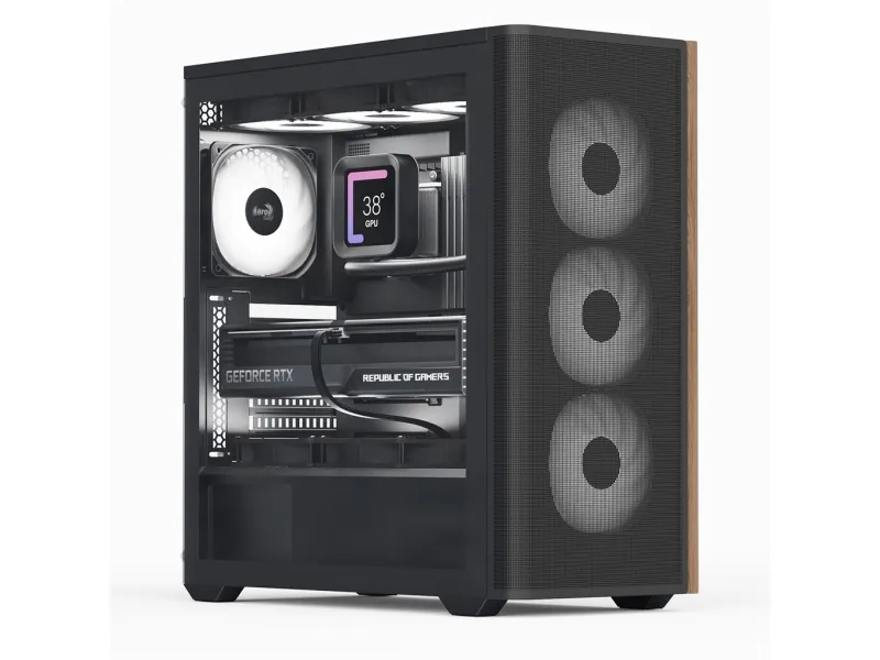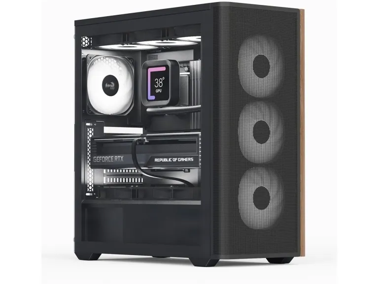 The AeroCool D501A features a wood-accented mesh front panel design, making it an appealing choice for a trendy mid-tower PC build. It supports liquid coolers up to 360mm and offers 11 fan slots, ensuring excellent cooling potential.