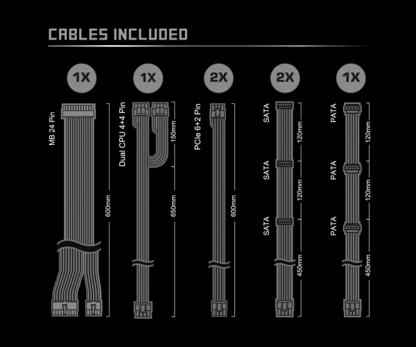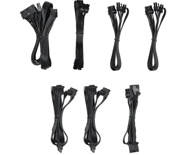 ATX-strømkabel 60 cm 2 x strøm 8-stifts +12 V med avtakbar 4-stifts seksjon modulær kabel 80 cm 4-stifts modulær strømkabel 69 cm 2 x 8-pins PCI Express-strøm med avtakbar 2-pins delmodulkabel 60 cm 2 x strøm 15-stifts SATA-kabel 69 cm