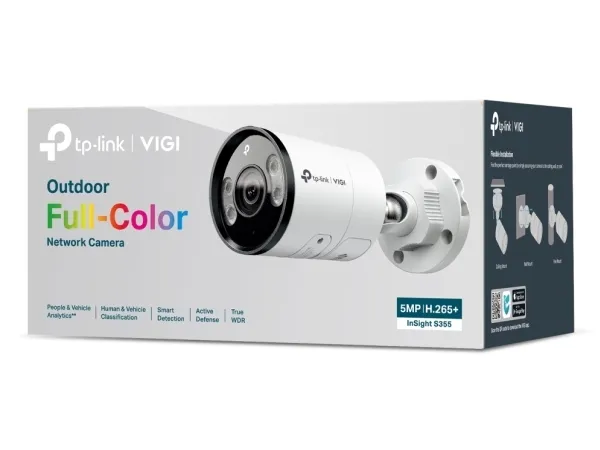 Efficient H.265+ Compression Technology H.265+ reduces the required bandwidth and storage space for videos while maintaining excellent image quality. It saves 57.5% and 15% more storage space compared to H.264 and H.265, respectively.TP-Link INSIGHT S355. Type: IP security camera, Placement supported: Outdoor, Connectivity technology: Wired. Mounting type: Wall, Product colour: White, Form factor: Bullet. Lens viewing angle, horizontal: 111.4°, Lens viewing angle, vertical: 58.8°, Lens viewing angle, diagonal: 134°. Sensor type: CMOS, Optical sensor size: 25.4 / 2.7 mm (1 / 2.7"). Detect distance: 64 m, Observe distance: 27 m, Recognize distance: 16 m