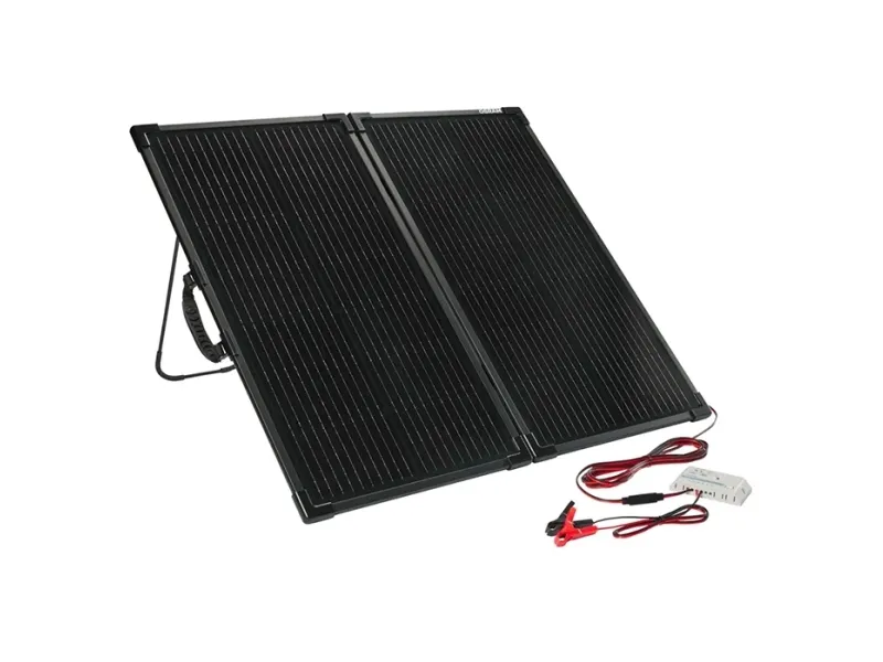 100W monokrystallinsk solpanel til effektiv opladning af 12V batterier Indbygget 12V/10A laderegulator beskytter mod overopladning USB-udgang til opladning af mindre elektroniske enheder Fungerer i overskyet vejr og kræver ikke direkte sollys IP65 vandafvisende design, velegnet til udendørs brug Let og foldbart design med robust aluminiumsramme Nem plug-and-play installation med 5 m batterikabel og klemmer