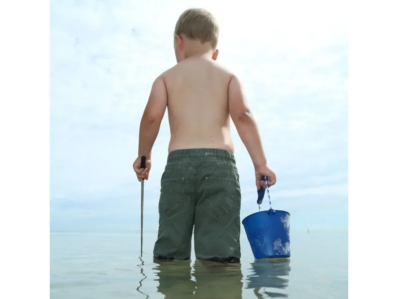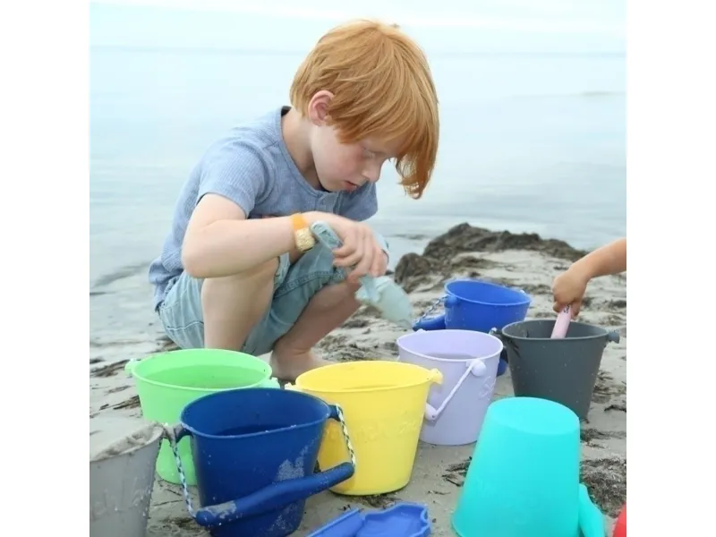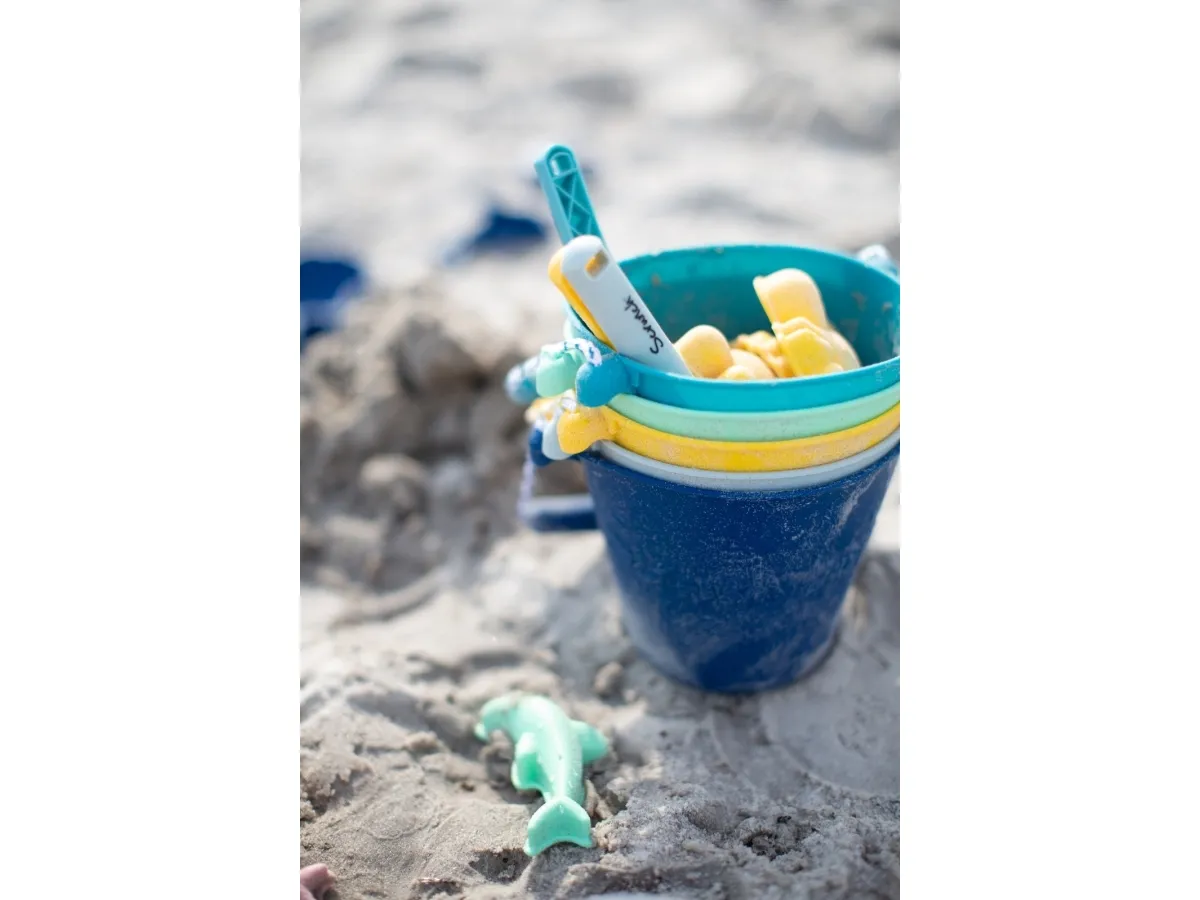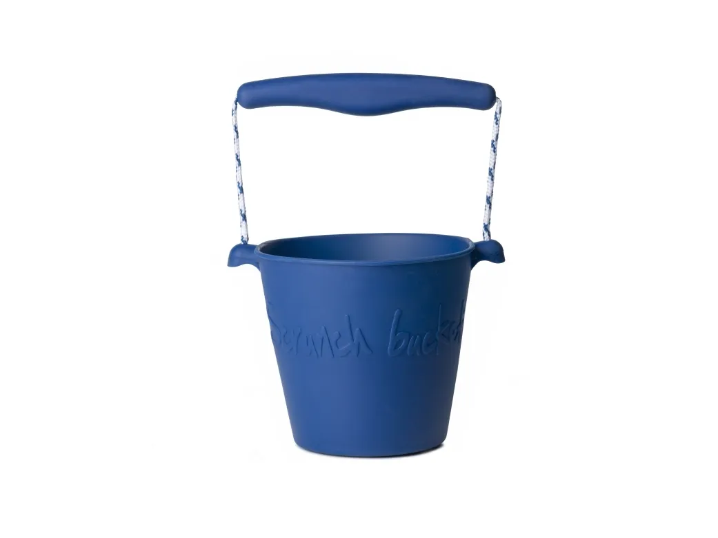 Scrunch-bucket er den originale foldbare silikonespand. Den så dagens lys, fordi to engelske mødre blev trætte af at købe billigt og dårligt strandlegetøj i tynd plast, som gik i stykker for et godt ord, når de var på ferie. De ønskede en mere bæredygtig tilgang til strandlegetøj. Det første produkt de skabte var Scrunch-bucket. Spanden, der kan foldes sammen til nærmest ingenting og kun vejer 210 gram. Alligevel kan den rumme hele 1,5 liter. Den er let at have med i kufferten eller strandtasken. Den tåler både sollys, høj varme og kulde. Her er den i en midnatsblå farve.