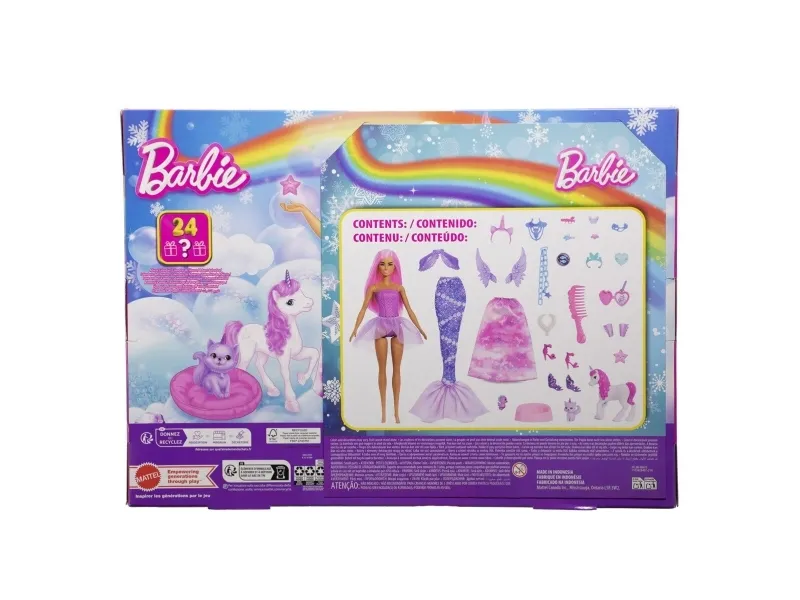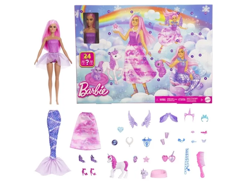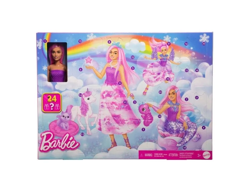 I denne Barbie Fantasy Adventskalenderen forvandles Barbie til en havfrue, en kongelig eller en vakker fe! Kalenderen inneholder en dukke og 24 magiske tilbehør for eventyrlige historier. Tilbehøret inkluderer fantasidyr som en enhjørning, en kattunge og en sjøhest, samt vakre tilbehør til dukken.