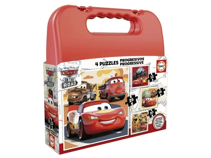 Puslespill med bilder fra Biler. Hvert sett inneholder 4 puslespill med forskjellig antall brikker hver (mellom 12 og 25) slik at barn kan prøve stadig vanskeligere oppgaver etter hvert som de vokser og lærer å sette puslespill. Størrelse på hvert sammensatt puslespill: 16 x 16 cm.