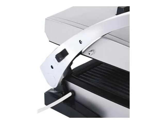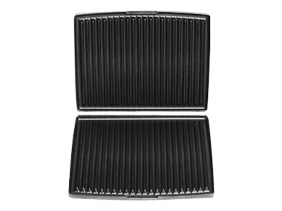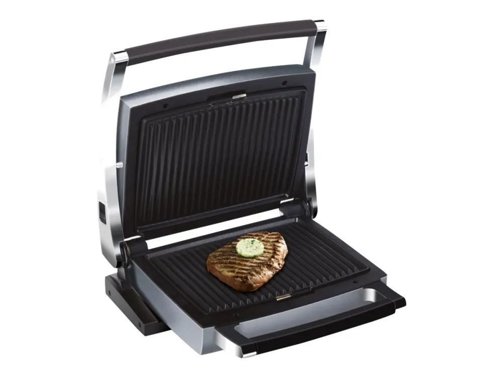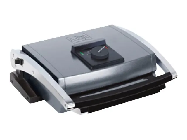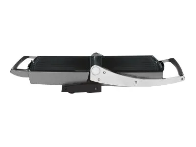The appliance is equipped with a thermostat button with 6 positions and with a red and green control lamp. The red lamp lights up when the appliance is plugged in and the green lamp lights up when the selected temperature is reached. For your convenience the appliance will stay opened at 105°. With the sliding knob at the left side of the appliance, you entirely open the appliance at 180° and transform it into a barbecue, where both places are perfectly joined together. To do this, pull the sliding knob in your direction and hold it in this position while you are opening the appliance to 180°.