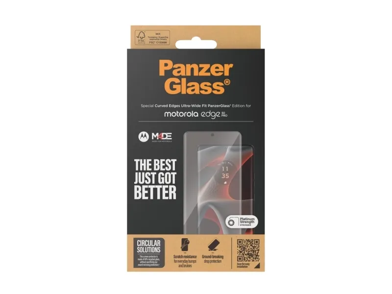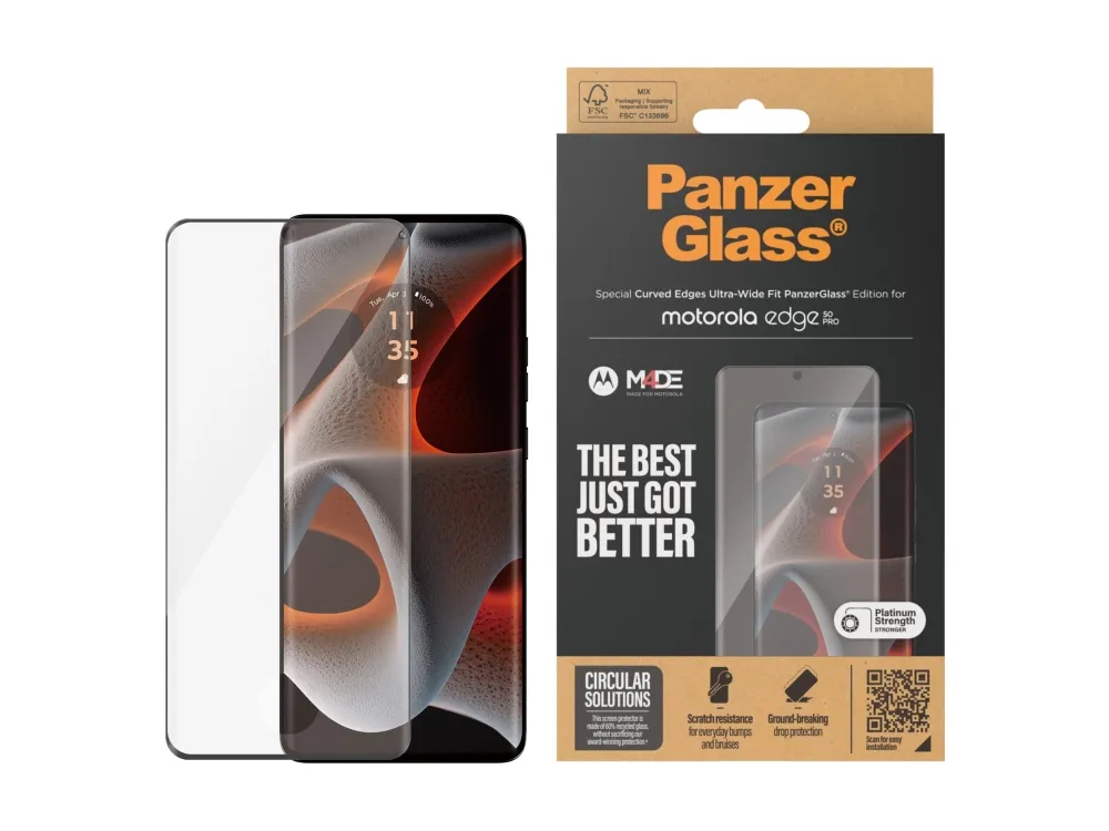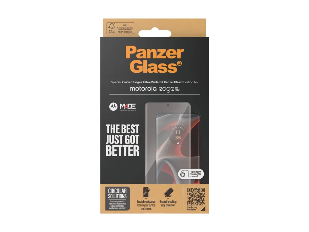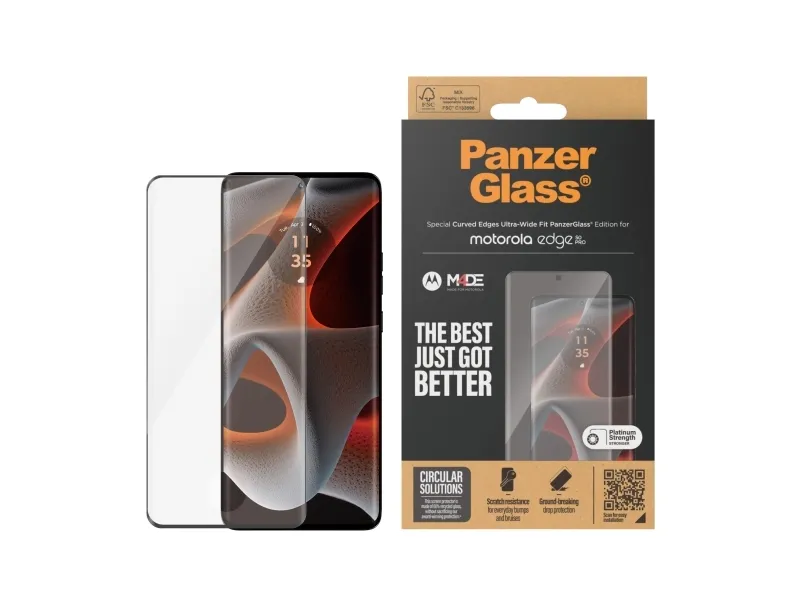 This PanzerGlass screen protector is made of 60% recycled material and provides higher scratch resistance. It even has an impressive shock-resistance capabilities and high-level drop protection, this PanzerGlass screen protector keeps your phone screen safe?from?accidental bumps against sharp-edged dangers, crushing falls onto stone-hard pavements and other hazards of everyday life. It also has a smudge-free coating that reduces traces of fingerprints and grease. Can it get any better? Maybe with the enclosed EasyAligner that makes installation a piece of cake (seriously!). And to make it even easier, we've included step-by-step instructions as well as a QR code for quick access to our online how-to video. And remember: Once the screen protection is applied, you'll never again fear the sight of your phone tumbling to the ground screen first. This may not happen, but if it does, you'll regret not having clicked "add to cart". This screen protection prolongs the lifetime of your phone so that one day you can pass it on to someone else who will love it just as much as you do. This is one way of working toward a more sustainable future. Another is to use less packaging: For this screen protector, we have managed to reduce the paper packaging by 33%* compared to previous models. And this product comes in a box made of recyclable FSC-certified paper. The screen protector is Ultra-Wide Fit, which means that it covers the front surface of your phone, providing a complete and crystal-clear view of your screen while still leaving a little room around the edges for a PanzerGlass case. If you want 360-degree phone protection, combine the screen protector and case with a PanzerGlass PicturePerfect or Hoops camera lens protector. *Measured by third-party lab by comparing the mass of the new paper packaging introduced in 2023 with the mass of the previous paper packaging introduced in 2022 (CPRTC, report No.?ZSA20231301-0016).