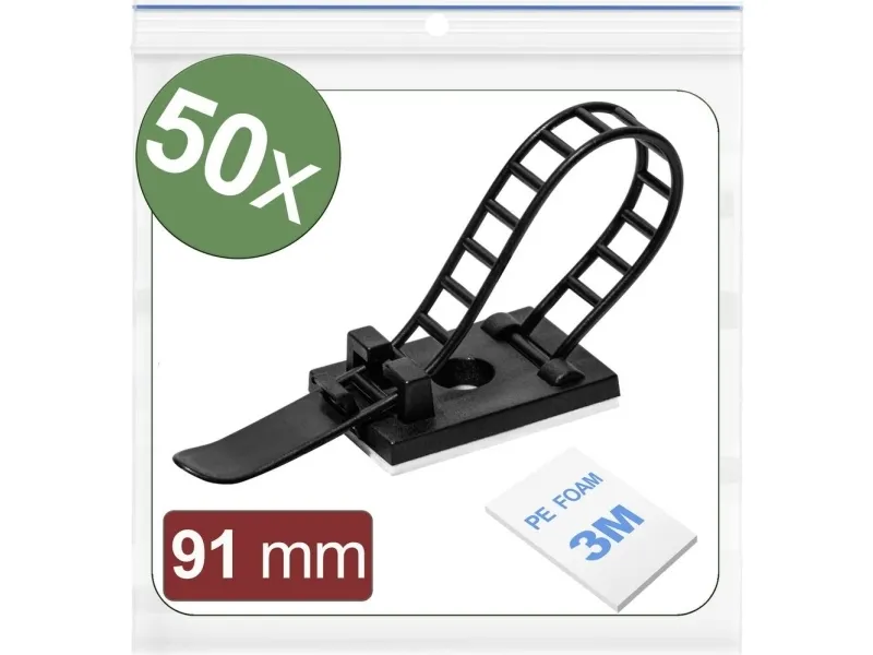 Kabelholder selvklæbende klembånd 91 mm sort Disse selvklæbende kabelholder med 3M klæbeflade er den enkle og billige løsning til organisering og fiksering af kabler og ledninger. Den anvendte 3M lim har en høj klæbekraft og holder holderen fast på stedet. Dette limsokkel er en genlukkelig fastgørelsesløsning med variabelt bundtet diameter. Det omfattende 50-stk. sæt giver meget indhold til at anbringe kabler, ledninger, slanger, lyskæder og meget mere rent.