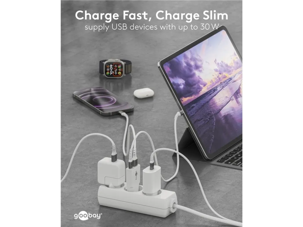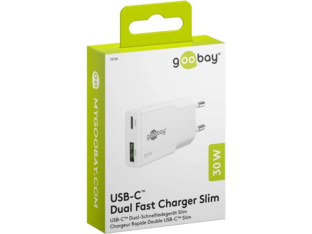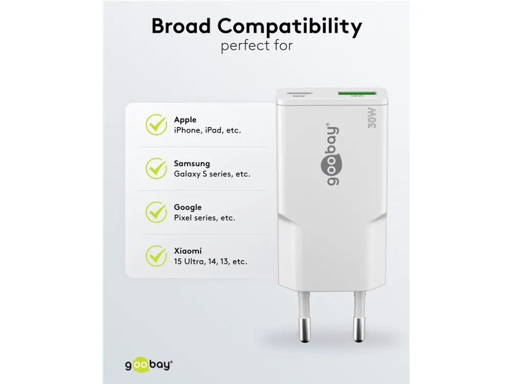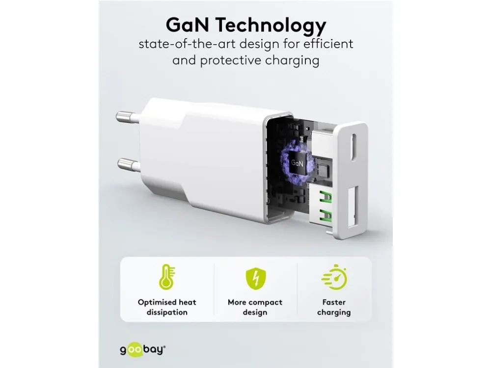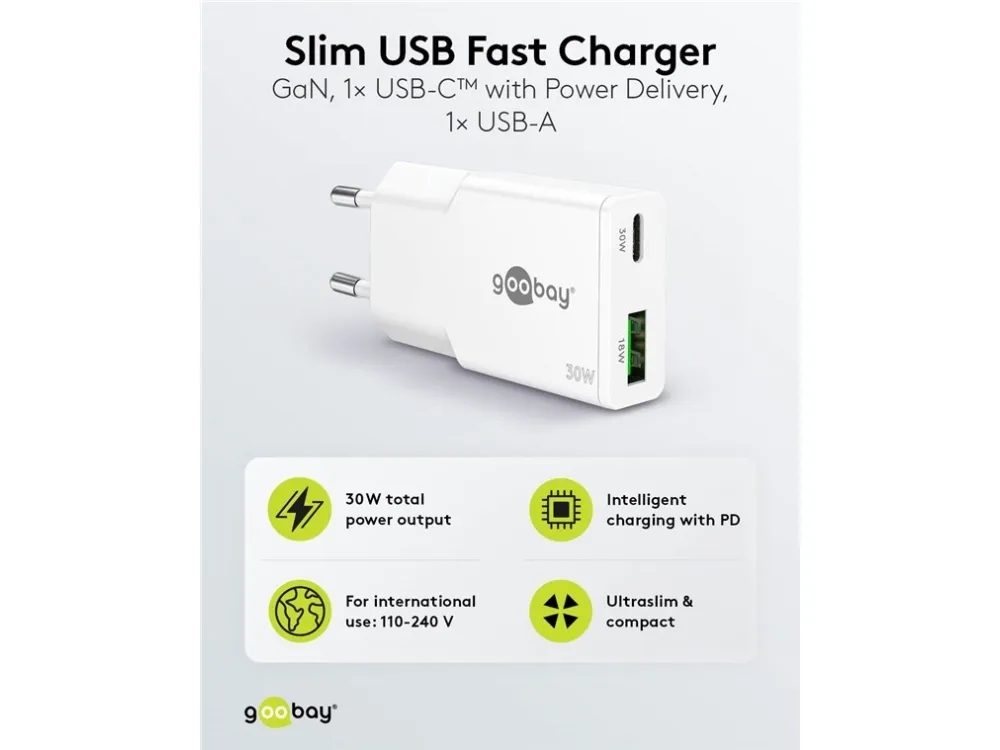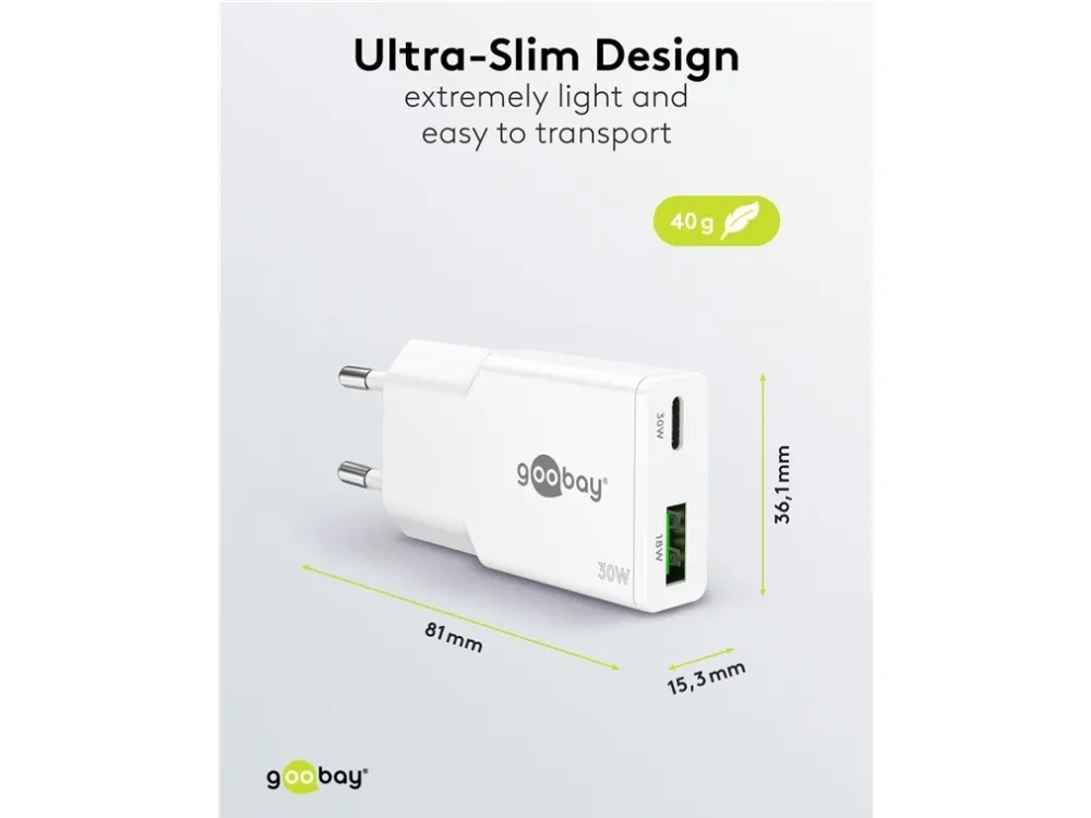 1x USB-C™-port (Power Delivery) og 1x USB-A-port (Quick Charge) Farveversion Med en effekt på 30 W er USB-opladeren skræddersyet til små enheder som smartphones, Bluetooth-hovedtelefoner, tablets eller powerbanks Med sit kompakte, minimalistiske og slanke design glider USB-vægopladeren nemt ned i enhver taske og er den perfekte rejsekammerat GaN-teknologiske halvledere muliggør hurtigere og mere effektiv opladning og et lettere og mere kompakt design sammenlignet med traditionelle opladere Med Power Delivery har USB-laderen en særlig sikker og dynamisk opladningsmetode, der bestemmer den optimale udgangseffekt for den tilsluttede enhed De to forskellige USB-porte reducerer dit behov for kun én opladeradapter – hvilket giver mindre rod med opladere og mindre bagage Kompatibel med smartphone-mærker som Apple iPhone, Samsung, Xiaomi, LG, Huawei samt tablets som Apple iPad eller Samsung Galaxy USB-C™-opladerens integrerede beskyttelseselektronik beskytter tilsluttede enheder mod overstrøm, overopladning og overophedning