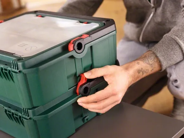 The SystemBox can be used as perfect storage for individual items. The SystemBox can be used separately or different SystemBoxes can be attached to one another and connected together. With the integrated vertical and horizontal handle, the SystemBoxes are easy to transport to any workspace.