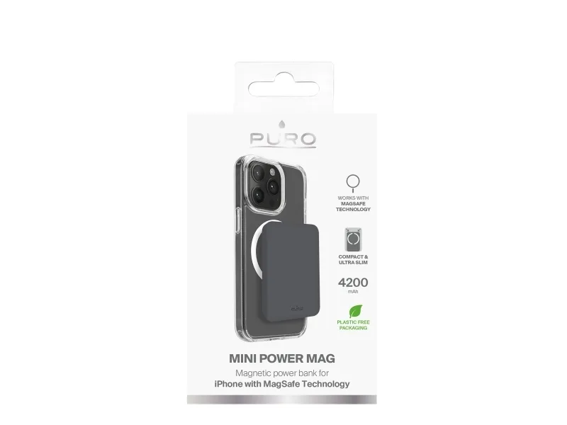 PURO Power Bank Wireless "Mini Power Mag" 4200 mAh til iPhone. Nødbatteri kompatibelt med MagSafe-teknologi til magnetisk opladning af iPhonesMagSafe-kompatibel opladningVirker som en trådløs opladningsholder uden magnetisk docking til ikke-MagSafe-kompatible enhederUltrakompakt design: KUN 1 CMVirker med alle MagSafe-kompatible covers eller uden covers til iPhone 12 og senere modeller4200 mAH-kapacitetBatteritype: litiumpolymercelle af høj kvalitetLED-indikator for restopladning: 1 led ca. 33%, 2 led ca. 66%, 3 led 100%Korpusmaterialer: metal + ABS