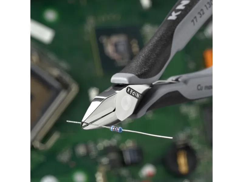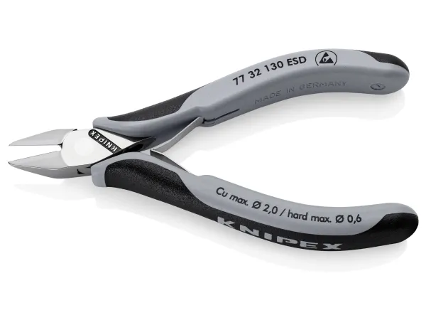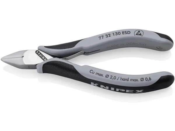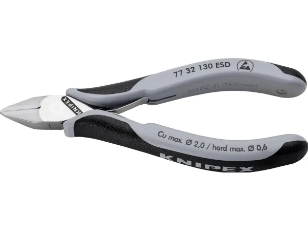 77 32 130 ESD Elektronik-skævbidere ESD Robust, belastningsoptimeret design med slørfrit indstiksled. Slanke håndtag, der er hævet mod tangens hoved, sørger for et følsomt og behageligt greb mellem tommel- og pegefinger. lavt kraftforbrug via meget høj udveksling. Belastningsoptimeret formgivning for en mere direkte fornemmelse for arbejdet. Dobbelt fjeder med lav friktion for jævn og smidig åbning. Spejlpolituren giver i forbindelse med en fin oliefilm en god rustbeskyttelse - ingen forstyrrelser i koblingskredsløbet pga. af afskallende kromdele. Skærekanterne er desuden laserhærdede, skærekanternes hårdhed er ca. 62 HRC. spidst hoved, med lille facet.