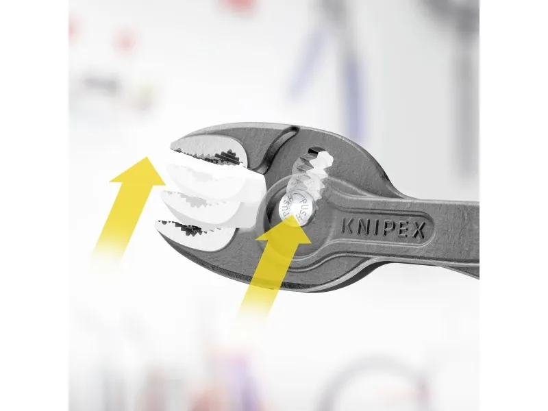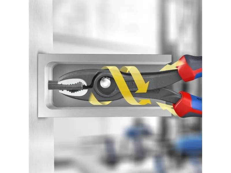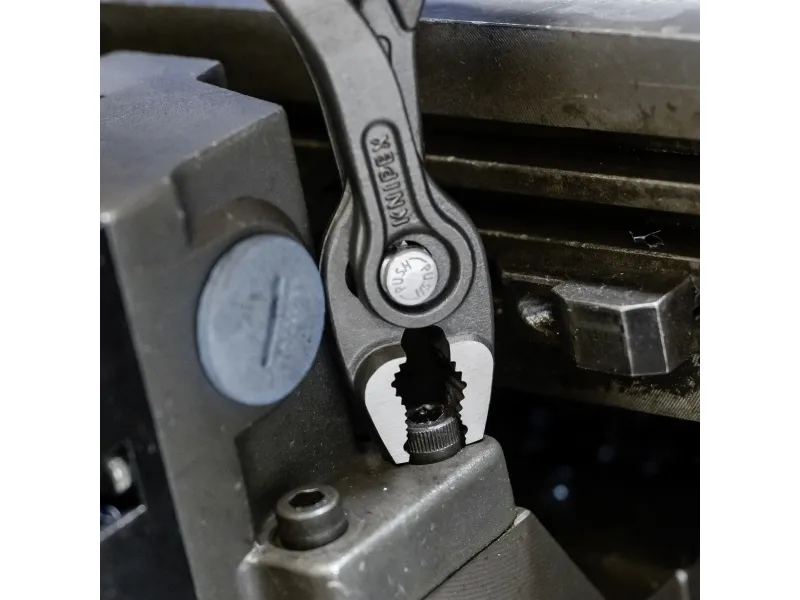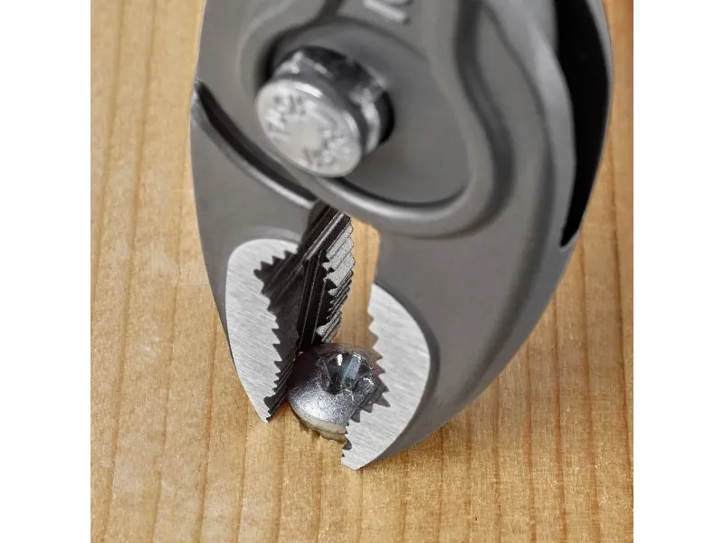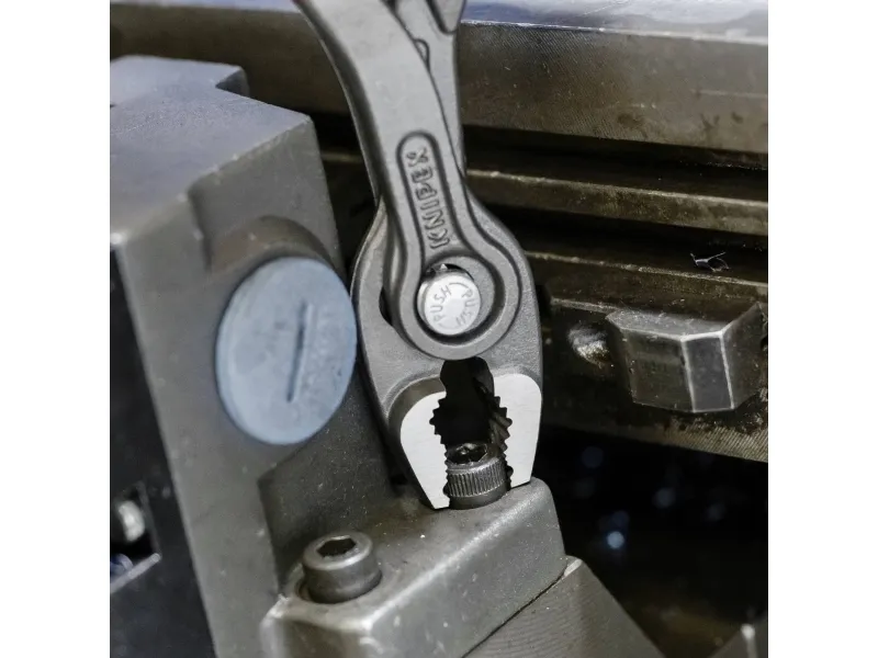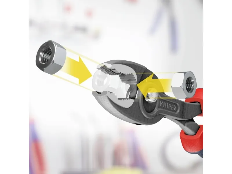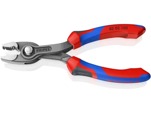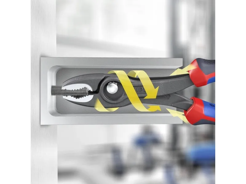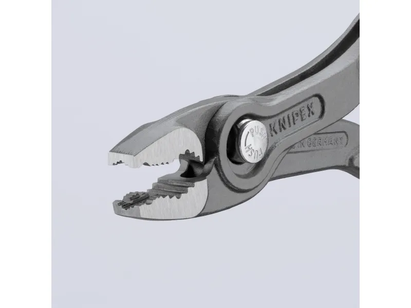 82 02 150 KNIPEX TwinGrip® Gribe, spænde og løsne skruer med ødelagte hoveder og gevind. Unik kombination: Med front- og sidegribefunktion, gennemstukket led, trykknapjustering. Effektiv frontgribekæbe med robust fortanding og høj udveksling ved værktøjsspidsen. Meget slank tang: Giver adgang til meget snævre konstruktioner, med slank drejezone til hurtigt skruearbejde. Stor front- og sidegrebs-kapacitet: til diametre og nøglevidder på 3 - 16 mm. Pålideligt, frontalt greb af flade emner op til 6 mm med trepunkt-system. Tredobbelt justerbart glideled med trykknapjustering til præcis justering af gribebredden. Optimeret geometri af sidegribeklo: med klemmeeffekt for maksimalt greb ved løsning og tilspænding. Knibebeskyttelse minimerer risikoen for at klemme fingrene. Holdbar og modstandsdygtig takket være et robust, fastgjort tangled,. Lille og handy - også velegnet til mere fintfølende arbejde.