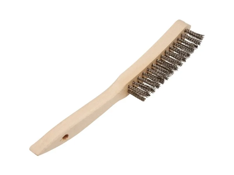 Rhodius EHBW, 12 stk. håndbørste 2 rækker mm, bølget, Topline, til rustfrit stål, stål, NE-metaller Maskinvægten: Børsten EHBW anvendes i manuel indsats. Materialeegnethed: Denne børste er specielt udviklet til bearbejdning af rustfrit stål (VA-stål, Inox), for eksempel 1.4301 (X5CrNi18-10 eller 304) samt stål (byggestål også sort stål, ST37, S235JR, 1.0037 eller karbonstål) og støbt stål, men også af aluminium samt andre NE-metaller som kobber, messing, bronze og så videre. På alle de her anførte materialer opnår de gode til meget gode resultater. Opbygning og produktion: Der anvendes rustfrit stål med bølget tråd af høj kvalitet i EHBW. Dette materiale, der anvendes mest, egner sig især godt til let overfladebearbejdning og afgratningsarbejde. Børsten er særligt fleksibel. Kvalitet: Håndbørsten er fremstillet af bøgetræ. Bøg er hverken for blød eller for hård, ligger behageligt i hånden, grebet splittes næsten ikke. Med den kan der opnås en meget høj rengøringseffekt. Brugeren får med EHBW det bedste Rhodius-værktøj i sin kategori. Rhodius Topline produkter giver en høj grad af ydeevne og kvalitet. Til anvendelse: Denne håndbørste kan anvendes universelt. Hvis brugeren skal ru, afruste eller rengøre, opnår den optimale resultater med denne håndbørste. Denne Rhodius-håndbørste til rustfrit stål egner sig optimalt til bearbejdning af rust- og syrebestandige stål, meget faste eller højlegeret stål, bygge-stål, værktøjestål, hærdede stål og meget stærke plader. Mål: EHBW's trådtykkelse udgør 0,30 mm. Denne håndbørste kan fås i udførelser med 2, 3, 4 eller 5 rækker besættelsestråd. Brancher: Det er det perfekte værktøj til de mange anvendelser og udfordringer inden for bilværkstedet og inden for låse, i anlægskonstruktion, i containerbyggeri, kedel- og beholderbygning, i konstruktionsstålbyggeri, i rørledningsbyggeri og også på montering. Bemærk: Børstens diameter, længden på det pågældende urenheder samt belægningsgraden er afgørende faktorer for de bedste resultater ved overfladebearbejdning. Jo længere trådlængden er, desto blødere og mere fleksibel er børsten. Dermed egner børsterne sig fremragende til bearbejdning af strukturerede emner og til en skånsom overfladebearbejdning. Jo kortere børstens trådlængde er, desto mere aggressiv kan man arbejde med børsten. For at opnå en så effektiv overfladebehandling som muligt skal du i bedste fald vælge den maksimale børstediameter, der kan monteres på det pågældende drevapparat. En høj sættetæthed er ikke kun grundlaget for en optimal ydelse, men også for en lang levetid på børsten. Lavere belægningsgrader øger til gengæld trådens fleksibilitet, og profilerede overflader kan bearbejdes bedre.