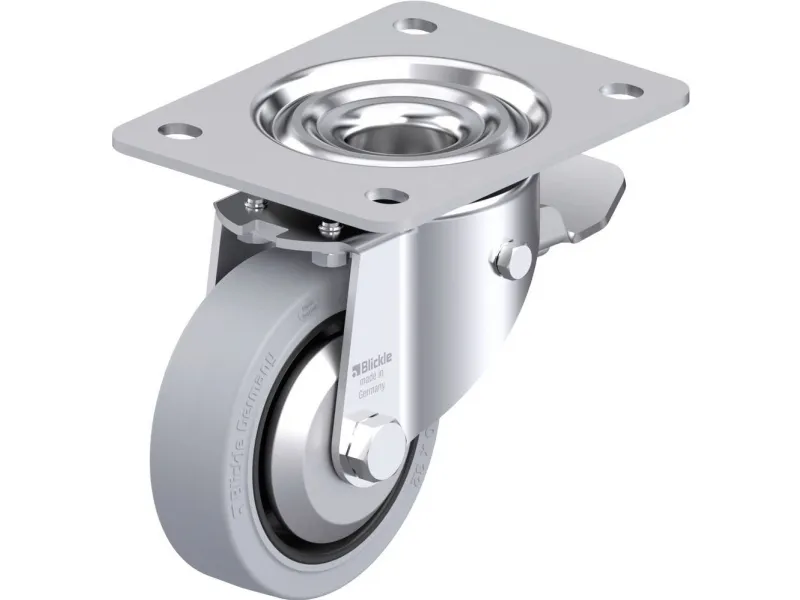 • Dæk: Førsteklasses elastisk, massivt gummi Blickle EasyRoll i letløbskvalitet, hårdhed 65 Shore A, farve grå, uden spor • Hjullegeme: Førsteklasses polyamid 6, brudsikker, farve sort
