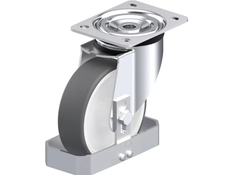 • Stålplade, galvaniseret, blå passiveret, Cr6-fri • Dobbelt kugleleje i drejekransen • Stabil mellembolt (fra hjuldiameter 150 mm) • Drejekranstætning • Minimal drejekransspil, letløbende løb, lang levetid takket være den specielle dynamiske Blickle-belastning