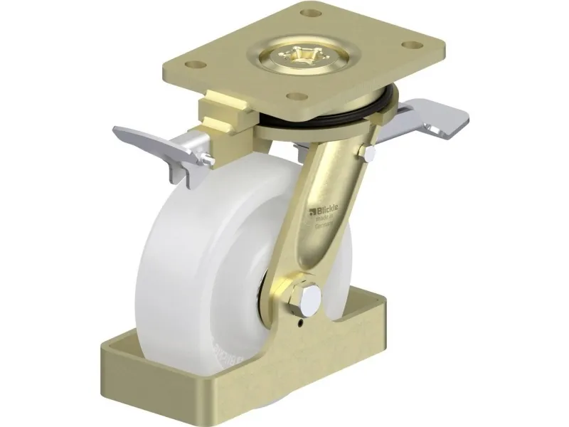 Styrehjul til tung last LS-SPO 150K-ST-RI4-FS Stålsvejst tunglast-styrehjul, kraftig drejekrflangespålægning med fastregulator top-top med retnings-bremse, med fodbeskyttelse af stål, Hjul af polyamid til tung last