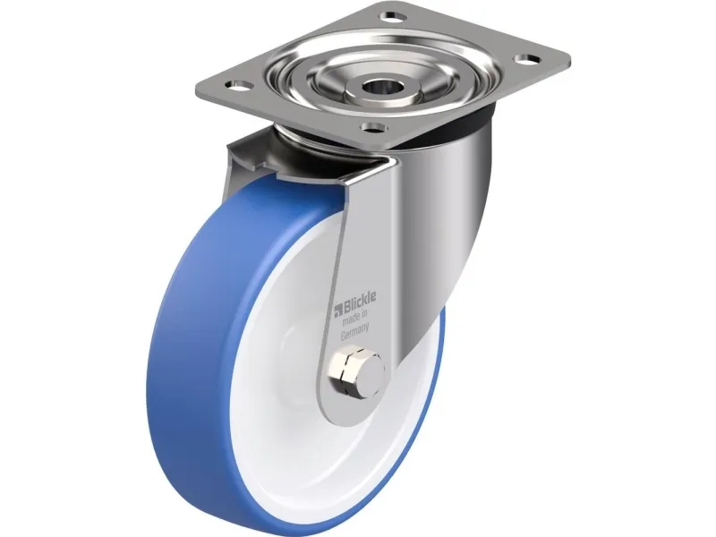 • Førsteklasses kromnikkelstål (1.4301/AISI 304), rustfri, glatslebet • Alle enkeltdele inkl. Akselmateriale er rustbestandigt • Dobbelt kugleleje i drejekransen • Stabil mellembolt • Drejekranstætning • Minimal drejekransspil, letløbende løb, lang levetid takket være den specielle dynamiske Blickle-belastning
