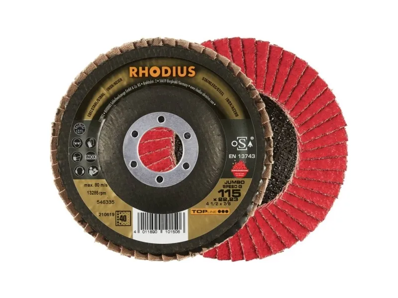 Rhodius Jumbo SPEED G, 10 stk. flapskive 115 x 22,23 mm, lige, korn 40, Topline, Made in Germany, til rustfrit stål, stål Egnethed til maskine: Denne flaphedslibeskive (lamelskive) egner sig til vinkelsliber i alle effektklasser. Med effektive drev opnår brugeren derefter den fulde ydeevne af skiven. Materialeegnethed: Rhodius FLAGSLIBESKIVE Jumbo SPEED G er specielt udviklet til forarbejdning af rustfrit stål (f.eks. V2A, 1.4301), stål (sortstål også byggestål, ST37, S235JR, 1.0037 eller karbonstål) og støbt stål. Skiven har her en meget lang funktionstid ved konstant aggressiv materialefjernelse. Opbygning og fremstilling: Skiven er fremstillet i henhold til en 13743 og er sikkerhedsmæssigt kontrolleret og desuden certificeret af OSA. Den har en bæreskive af glasfiber. Brugeren kan arbejde med et Hohem-Jumbo SPEED G anvender som slibekorn en førsteklasses keramisk korund (sintret korund). Dette er selvslibende. Alle Rhodius-lamelskiver er derudover fri for jern og svovl. På denne skive ligger lamellerne flade op. Hvis der kræves en jævn slibning, letter lamellernes flade placering arbejdet ganske særligt. Kvalitet: Brugeren får med Jumbo SPEED G det bedste Rhodius-værktøj i sin kategori. Rhodius Topline produkter giver en høj grad af ydeevne og kvalitet. Anvendelse: Jumbo SPEED G overbeviser med lang levetid ved ekstremt aggressiv materialefjernelse og imponerer med en meget lang levetid. Den særlige top-size-belægning af lamellerne sørger samtidig for en endnu køligere slibning. Dette premiumværktøj er perfekt egnet til krævende slibearbejder og giver et optimalt pris-/ydelsesforhold. Mål: Lamelslibeskive fås i diameter 115 mm og 125 mm samt alt efter udførelse med EPA-granuleringerne 40, 60, 80.