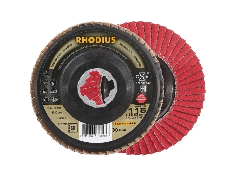 Rhodius Jumbo SPEED P X-LOCK, 10 stk. flagslibeskive 115 x 22,23 mm, skrå, korn 60, Topline, Made in Germany, til rustfrit stål, stål Egnethed til maskine: Denne flaphedslibeskive (lamelskive) egner sig til vinkelsliber i alle effektklasser. Med effektive drev opnår brugeren den fulde ydeevne af skiven. Materialeegnethed: Rhodius FLAGSLIBESKIVE Jumbo SPEED P X-LOCK er målrettet til forarbejdning af rustfrit stål (for eksempel V2A, 1.4301), stål (sortstål også byggestål, ST37, S235JR, 1.0037 eller karbonstål) og støbt stål. Skiven har her en meget lang funktionstid ved konstant aggressiv materialefjernelse. Opbygning og fremstilling: Skiven er fremstillet i henhold til en 13743 og er sikkerhedsmæssigt kontrolleret og desuden certificeret af OSA. Bæreskive er af polyamid. Det muliggør en meget blød slibning. Jumbo SPEED P X-LOCK anvendes som slibekorn en førsteklasses keramisk korund (sintret korund). Dette er selvslibende. Alle Rhodius-lamelskiver er desuden jern- og svovlfrie. Lamellerne ligger konisk op på denne skive. Den koniske placering af lamellerne på 10° forbedrer ergonomien under slibningen og letter dermed håndteringen. Kvalitet: Brugeren får med vision SPEED P X-LOCK det bedste Rhodius-værktøj i sin kategori. Rhodius Topline produkter giver en høj grad af ydeevne og kvalitet. Anvendelse: Jumbo SPEED P X-LOCK imponerer med lang holdbarhed ved ekstremt aggressiv materialefjernelse og imponerer med en meget lang levetid. Den særlige top-size-belægning af lamellerne sørger samtidig for en endnu køligere slibning. Dette premiumværktøj er perfekt egnet til krævende slibearbejde og til et optimalt pris-ydelses-forhold. I programmet imponerer Jumbo SPEED P X-LOCK med de lange, overlappende lameller. Dette sørger for en mærkbar mere ydeevne og en aggressiv materialefjernelse. Mål: Lamelslibeskive fås i diameter 115 mm og 125 mm samt alt efter udførelse med EPA-granuleringerne 40, 60 og 80.