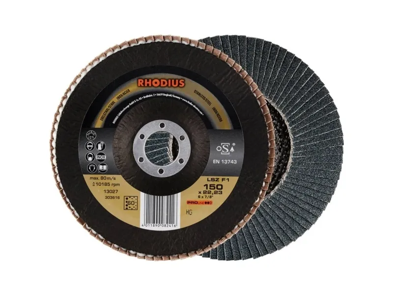 Rhodius LSZ F1, 10 stk. Lamelslibeskive 150 x 22,23 mm, skrå, korn 60, proline, til rustfrit stål, stål Egnethed til maskine: Denne flaphedslibeskive (lamelskive) egner sig til vinkelsliber i alle effektklasser. Materialeegnethed: Rhodius forskruningsplade LSZ F1 er udviklet specielt til bearbejdning af rustfrit stål (f.eks. V2A, 1.4301), stål (sort stål også byggestål, S37, S235JR, 1.0037 eller karbonstål) og støbt stål. Skiven har her en meget lang funktionstid ved konstant aggressiv materialefjernelse. Opbygning og fremstilling: Skiven er fremstillet i henhold til en 13743 og er sikkerhedsmæssigt kontrolleret og desuden certificeret af OSA. Den har en bæreskive af glasfiber. Brugeren kan arbejde med et Hohem Presse. Ved LSZ F1 anvendes en førsteklasses zirconkorund som slibekorn. Alle Rhodius-lamelskiver er desuden jern- og svovlfrie. Lamellerne ligger konisk op på denne skive. Den koniske placering af lamellerne på 10° forbedrer ergonomien under slibningen og letter dermed håndteringen. Kvalitet: Brugeren får med LSZ F1 et værktøj, der lever op til de høje kvalitetskrav inden for industri og håndværk. For at kunne arbejde endnu mere økonomisk anbefaler Rhodius færeslibeskive fra kvalitetslinjen TOP. Mål: Lamelslibeskive fås i diametre fra 115 mm til 180 mm samt afhængigt af udførelse med EPA-granuleringerne 24, 40, 60, 80 og 120. Bemærk: Rhodius fremstiller også denne flagslibeskive til vinkelsliber med X-LOCK hurtigspændesystem.