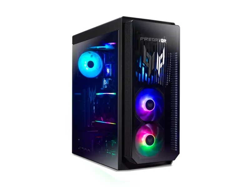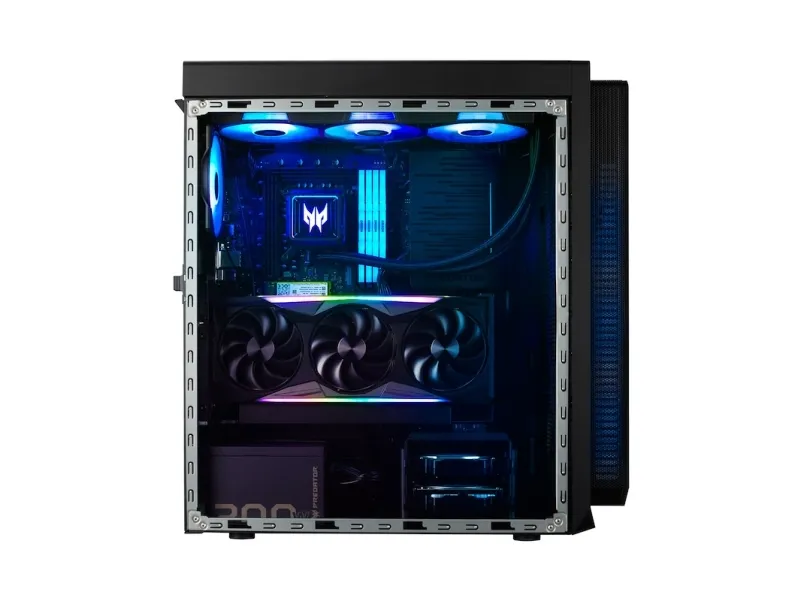 The Acer Predator Orion 7000 PO7-660 offers powerful gaming performance, equipped with a Core Ultra 9 processor featuring 24 cores and a clock speed reaching 5.7 GHz. With a substantial 36 MB L3 cache and 2.048 TB SSD storage using PCI Express 4.0, this tower computer ensures fast data access and ample space for games and applications. The combination of DDR5 RAM with RGB lighting adds a modern aesthetic while enhancing performance. Connectivity options include multiple USB ports, HDMI, DisplayPort, and Thunderbolt 4, supporting an extensive range of peripherals for any gaming setup. The system is also compatible with advanced wireless protocols including Wi-Fi 6 and Wi-Fi 7, facilitated by the Killer E3100G Ethernet controller for stable online gaming. With a robust 1200 watts power supply boasting 89% efficiency, the Acer Predator Orion 7000 is designed to deliver sustained performance for an immersive gaming experience.