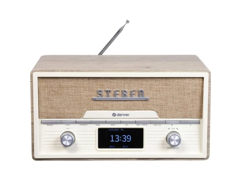 Denver MDA-525LW LIGHT WOOD DAB/FM-radio Oplev charmen fra Retro med moderne lyd Denver MDA-525DW - en fusion af klassisk design og moderne teknologi. Dette DAB+/FM-retro-musiksystem giver ikke kun et skær af nostalgi i dit hjem, men leverer med sine kraftige 2x50-W-højttalere også krystalklar lydkvalitet.