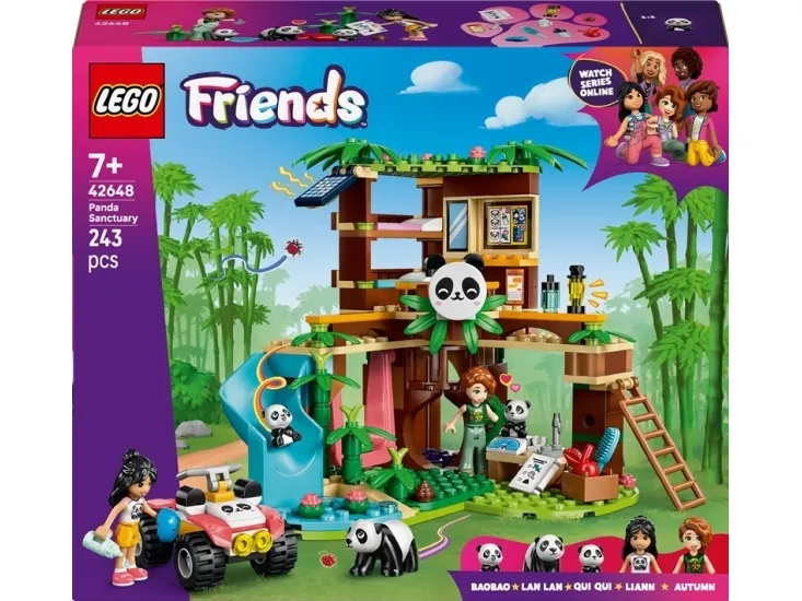 Oppdag et gøyalt byggesett for barn, som er proppfullt av pandamoro! Med settet LEGO® Friends Pandareservatet, byggelekesett (42648) kan jenter, gutter og dyrevenner fra sju år finne på spennende panda-redningsoppdrag. Settet inkluderer en byggbar trehytte og ATV, to minidukkefigurer og tre pandafigurer og inspirerer barn til kreativ late som-lek. Gjør deg klar for pandastiske lekeopplevelser når barn forteller historien om Autumn og Liann som hjelper til i pandareservatet. Settet inneholder masse tilbehør, blant annet en vekt og stelleutstyr. Det er også fullt av gøyale detaljer – send pandaene rutsjende ned sklien som ender i vannet, eller la dem kose seg på huskene. ATV-en er perfekt til transport av pandaenes favorittmat, bambus. Når pandaene tar seg en lur i hulen sin, kan vennene klatre opp stigen til trehytta, hvor det er et skrivebord og to senger. Med dette settet kan barn utforske vennskapstemaer og styrke sine sosiale ferdigheter gjennom omsorgsfull lek.
