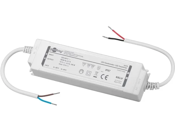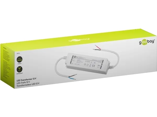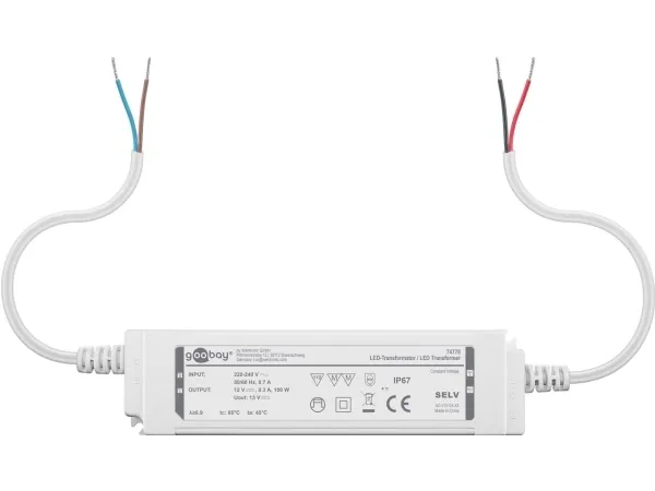 konstantspændingstransformator (CV) til udendørs brug, ikke dæmpbar Robust LED-transformer uden minimumsbelastning til tilslutning af lyskilder som G4- eller GU 5.3 LED-spots, LED-strips og LED-moduler til 220-240 V (AC) netforsyning Den konstante spænding på 12 V (DC) muliggør fleksibel tilføjelse og fjernelse af individuelle LED'er i parallelle kredsløb og variable længder af LED-strips Med IP67 er LED-driveren perfekt til udendørs brug, f.eks. til udendørsbelysning, overvågningssystemer, fugtige rum som badeværelser eller køkkener og industrielle fugtige rum Ideel til at forsyne flere LED'er eller LED-strips samtidigt med en samlet effekt på op til 100 W Indgang og udgang på 12 V LED-transformeren med 20 cm løse kabelender (2-polet) til forenklet installation LED-driveren er særlig sikker takket være overspændings- og kortslutningsbeskyttelse samt elektronisk isolation i overensstemmelse med beskyttelsesklasse II Mål (L x B x H): 193 x 52 x 37 mm, Bemærk: LED-transformeren kan ikke dæmpes